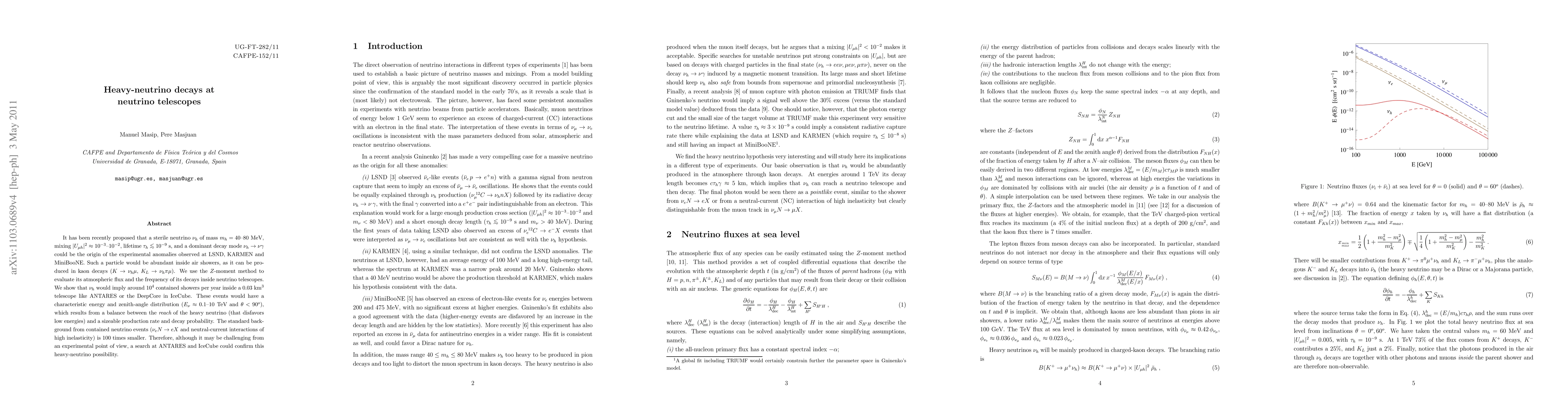This paper investigates the potential decay of a proposed sterile neutrino (\(\nu_h\)) with mass 40-80 MeV inside neutrino telescopes, suggesting it could explain anomalies observed at LSND, KARMEN, and MiniBooNE. The study predicts around 10^4 contained showers per year in telescopes like ANTARES or DeepCore, with a distinctive energy and zenith-angle distribution, offering a promising yet challenging search for this heavy neutrino.