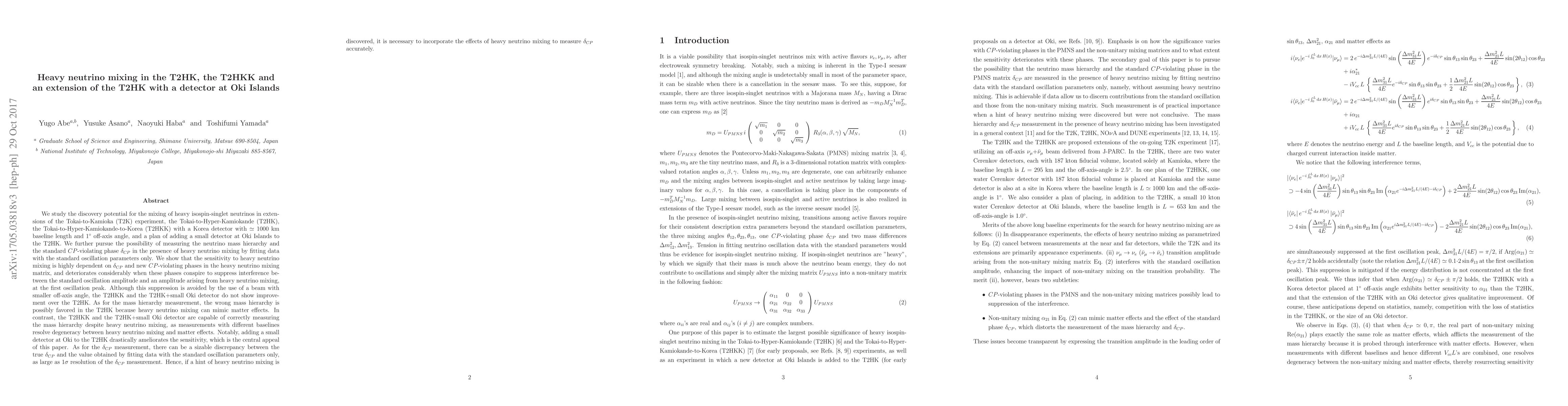 This paper investigates the potential for discovering heavy neutrino mixing in the T2HK, T2HKK, and an extended T2HK with an additional detector at Oki Islands. It finds that while sensitivity to heavy neutrino mixing is reduced in the T2HK and T2HKK, adding a detector at Oki Islands significantly improves this sensitivity. The study also assesses the feasibility of measuring mass hierarchy and CP-violating phase under the assumption of unitary mixing, revealing that this is possible in the T2HKK and the extended T2HK due to varied data collection.