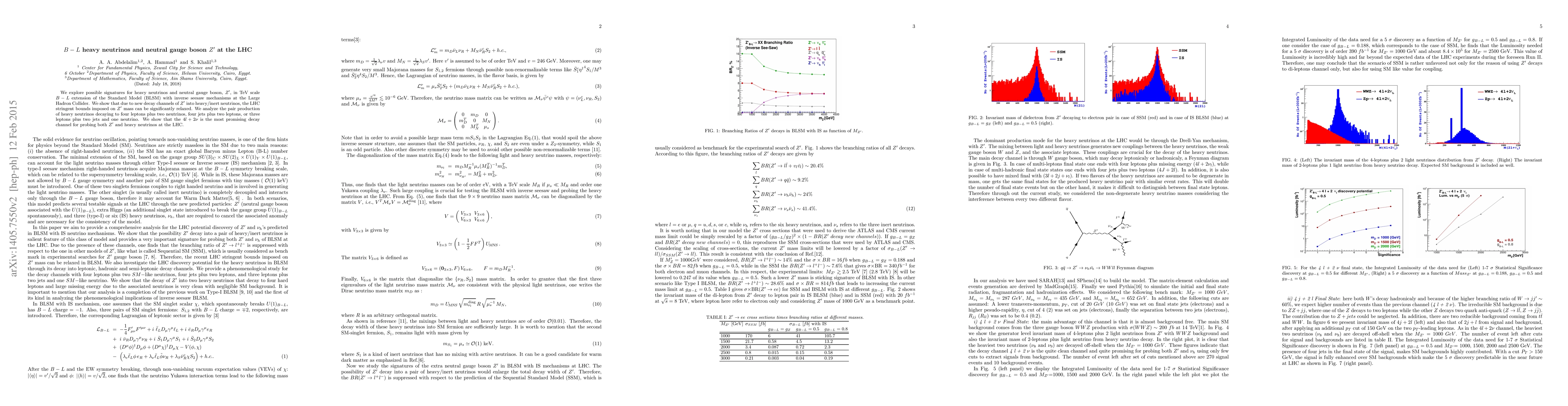 We explore possible signatures for heavy neutrinos and neutral gauge boson, Z', in TeV scale B-L extension of the Standard Model (BLSM) with inverse seesaw mechanisms at the Large Hadron Collider. We show that due to new decay channels of Z' into heavy/inert neutrinos, the LHC stringent bounds imposed on Z' mass can be significantly relaxed. We analyze the pair production of heavy neutrinos decaying to four leptons plus two neutrinos, four jets plus two leptons, or three leptons plus two jets and one neutrino. We show that the 4l + 2 nu is the most promising decay channel for probing both Z' and heavy neutrinos at the LHC.