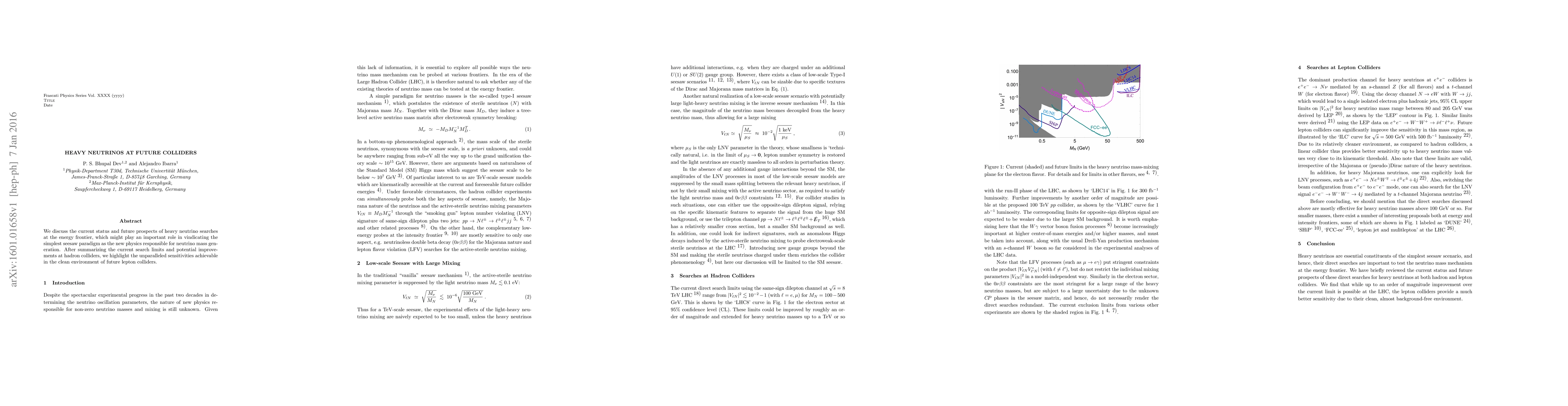 This paper reviews the current limits and future prospects for detecting heavy neutrinos at high-energy colliders, emphasizing their role in supporting the seesaw mechanism for neutrino mass. It highlights the enhanced sensitivity of future lepton colliders compared to hadron colliders.