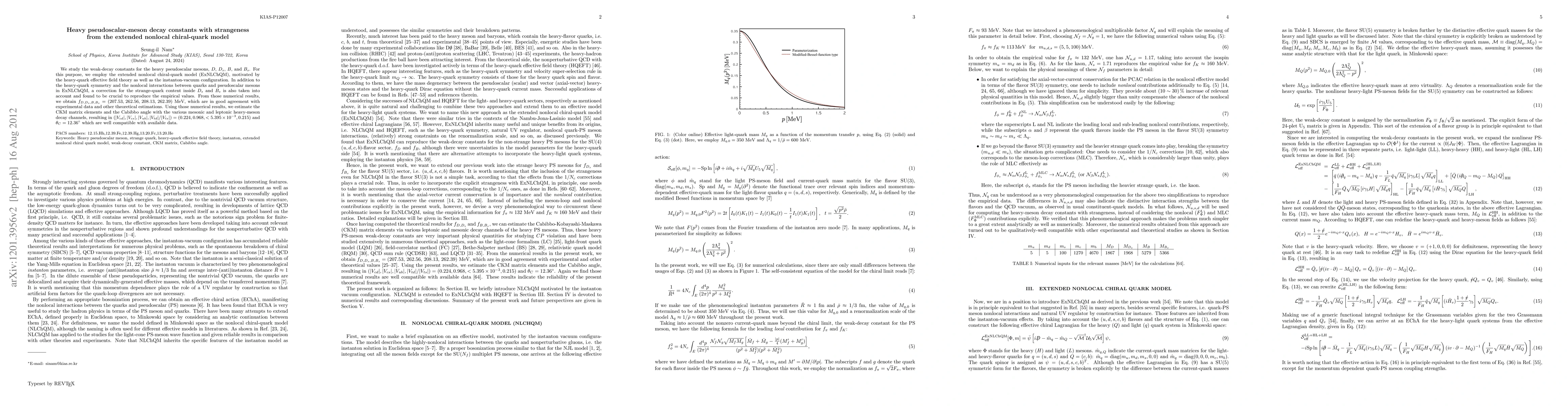 We study the weak-decay constants for the heavy pseudoscalar mesons, D, Ds, B, and Bs. For this purpose, we employ the extended nonlocal chiral-quark model (ExNLChQM), motivated by the heavy-quark effective field theory as well as the instanton-vacuum configuration. In addition to the heavy-quark symmetry and the nonlocal interactions between quarks and pseudoscalar mesons in ExNLChQM, a correction for the strange-quark content inside Ds and Bs is also taken into account and found to be crucial to reproduce the empirical values. From those numerical results, we obtain f_{D,Ds,B,Bs}=(207.53, 262.56, 208.13, 262.39) MeV, which are in good agreement with experimental data and other theoretical estimations. Using those numerical results, we compute the CKM matrix elements and the Cabibbo angle, using various mesonic and leptonic heavy-meson decay channels, resulting in (|V_{cd}|,|V_{cs}|,|V_{ub}|,|V_{td}|/|V_{ts}|)=(0.224,0.968,<5.395*10^{-3},0.215) and theta_C=12.36^o which are well compatible with available data.