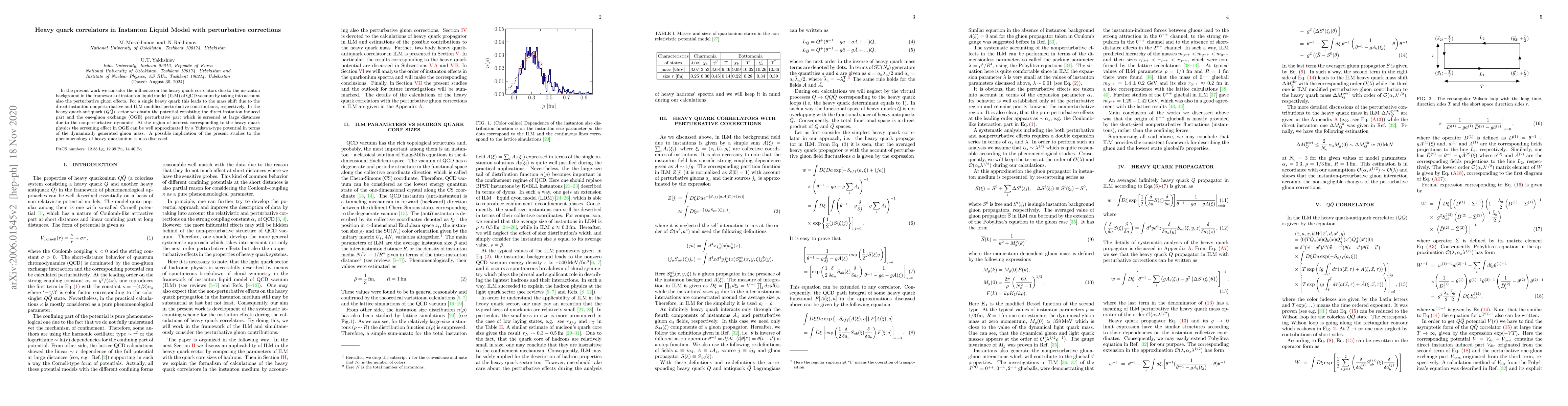 This paper investigates heavy quark correlators within the Instanton Liquid Model (ILM) of QCD, incorporating both instanton background and perturbative gluon effects. It reveals mass shifts for single heavy quarks and a Yukawa-type potential for heavy quark-antiquark interactions, with implications for heavy quarkonium phenomenology.