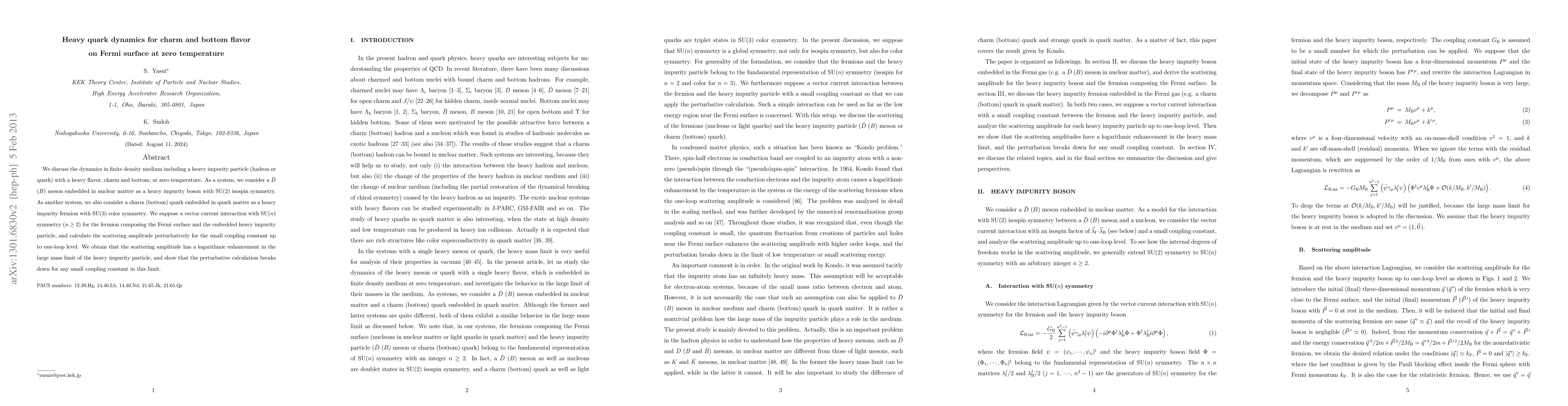 This paper investigates the dynamics of charm and bottom flavor heavy quarks or mesons embedded in dense mediums at zero temperature, focusing on scattering amplitudes. It reveals a logarithmic enhancement in scattering amplitude for large heavy impurity masses and notes the breakdown of perturbative calculations in such limits.