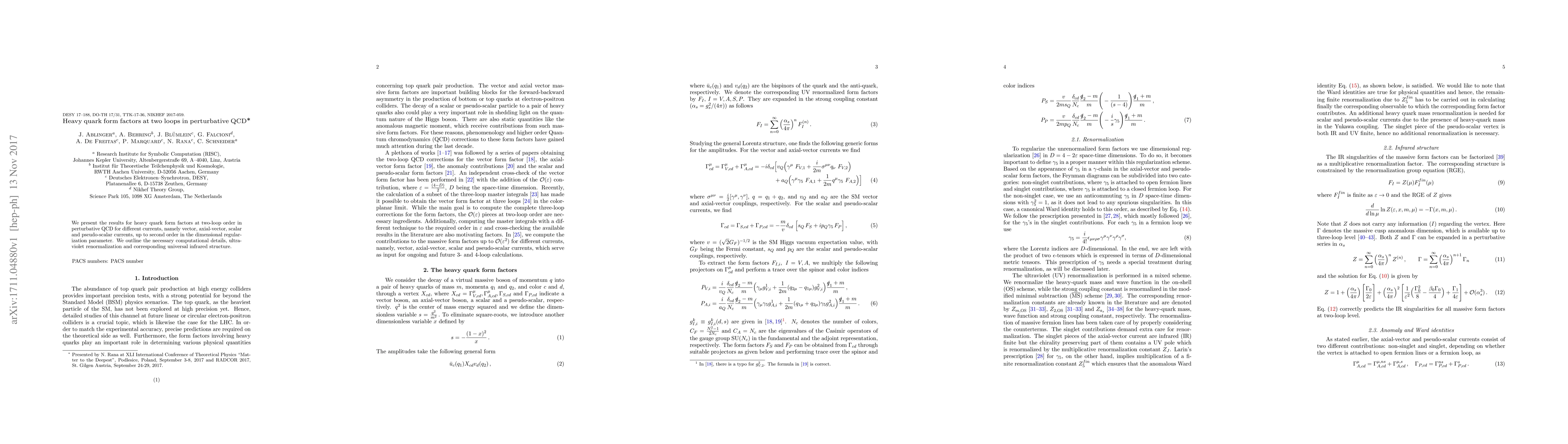 This paper computes heavy quark form factors at two-loop order in perturbative QCD for vector, axial-vector, scalar, and pseudo-scalar currents, including details on ultraviolet renormalization and universal infrared structure. The results are presented up to second order in the dimensional regularization parameter.