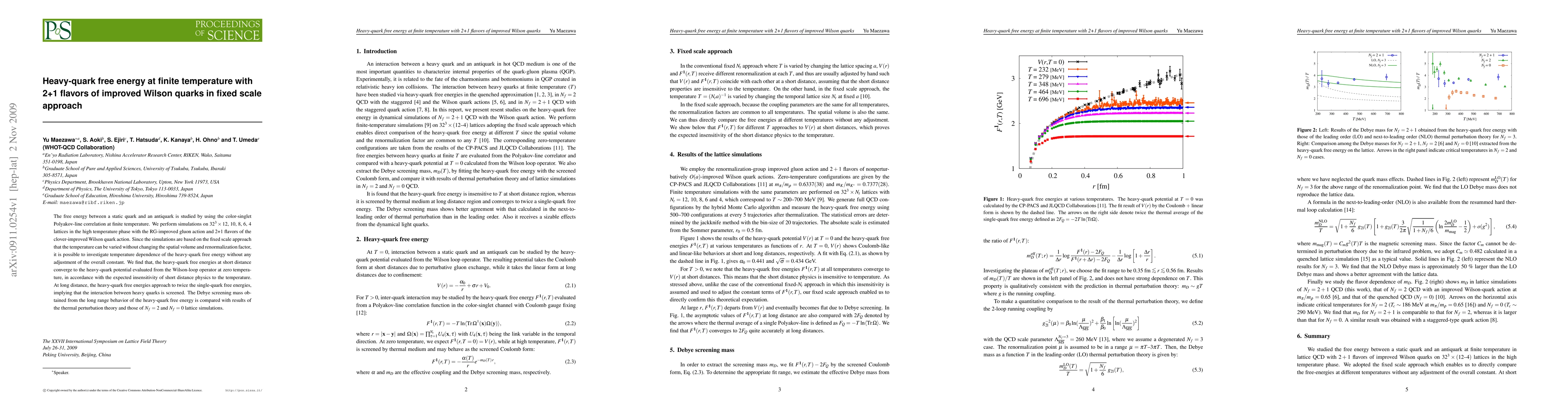 This study investigates the heavy-quark free energy at finite temperature using 2+1 flavors of improved Wilson quarks in simulations across various lattice sizes, finding convergence to zero-temperature potentials at short distances and screening of interactions at long distances. The fixed scale approach allows for temperature variation without adjusting the spatial volume or renormalization factor.