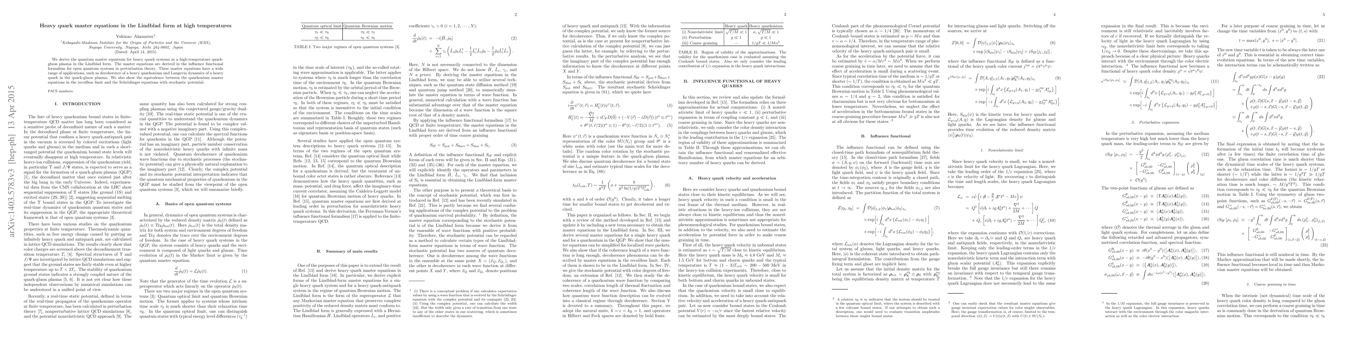 We derive the quantum master equations for heavy quark systems in a high-temperature quark- gluon plasma in the Lindblad form. The master equations are derived in the influence functional formalism for open quantum systems in perturbation theory. These master equations have a wide range of applications, such as decoherence of a heavy quarkonium and Langevin dynamics of a heavy quark in the quark-gluon plasma. We also show the equivalence between the quarkonium master equations in the recoilless limit and the Schroedinger equations with stochastic potential.