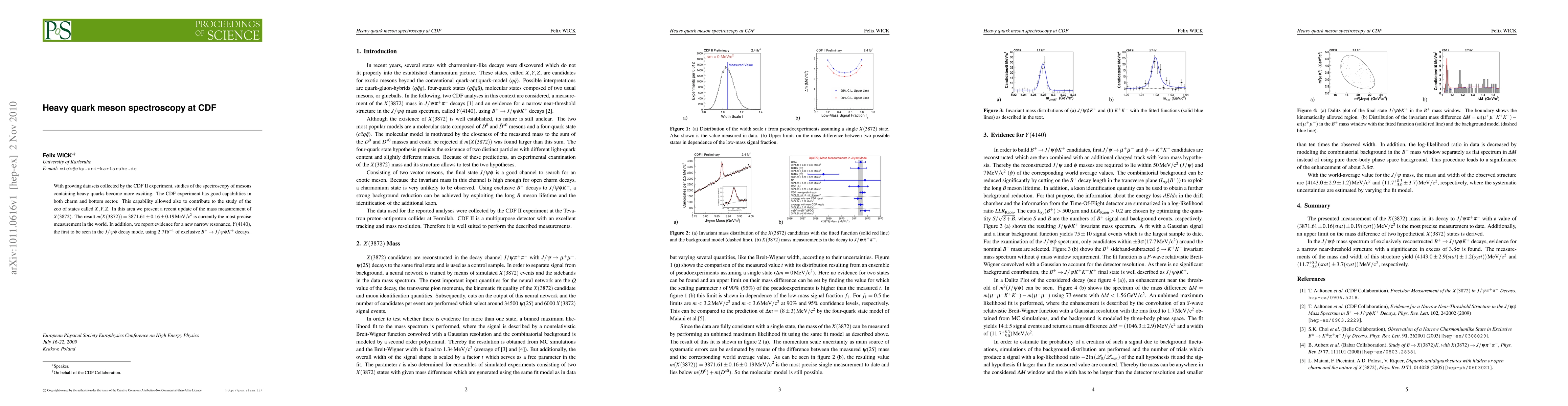 With growing datasets collected by the CDF II experiment, studies of the spectroscopy of mesons containing heavy quarks become more exciting. The CDF experiment has good capabilities in both charm and bottom sector. This capability allowed also to contribute to the study of the zoo of states called X,Y,Z. In this area we present a recent update of the mass measurement of X(3872). The result m(X(3872)) = 3871.61 +- 0.16 +- 0.19 MeV is currently the most precise measurement in the world. In addition, we report evidence for a new narrow resonance, Y(4140), the first to be seen in the J/psi phi decay mode, using 2.7 invfb of exclusive B+ to J/psi phi K+ decays.