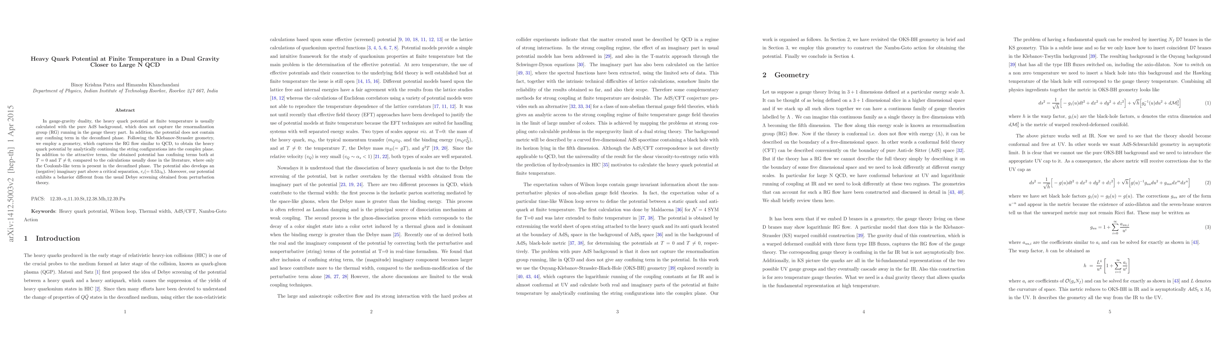 This study uses a Klebanov-Strassler geometry in gauge-gravity duality to calculate the heavy quark potential at finite temperature, capturing renormalization group flow and confining terms. Unlike traditional methods, it reveals a confining potential in the deconfined phase and a negative imaginary part above a critical separation, differing from standard Debye screening.