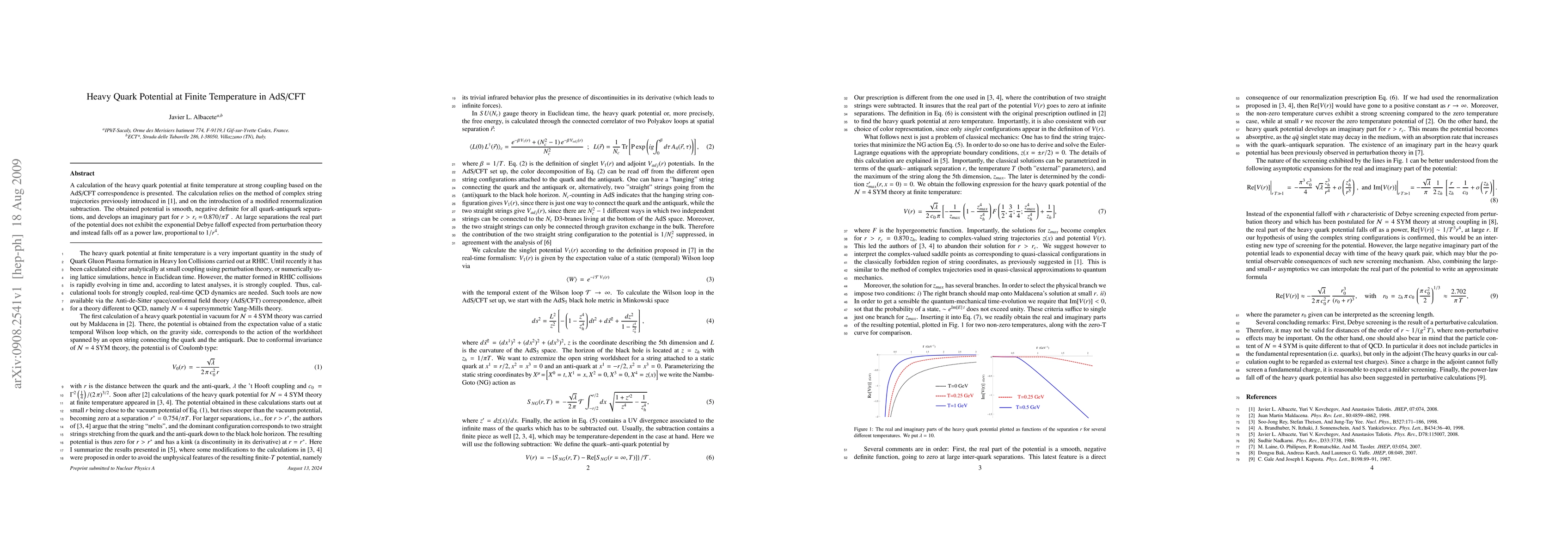 This paper calculates the heavy quark potential at finite temperature using the AdS/CFT correspondence, revealing a smooth, negative potential that becomes imaginary for separations exceeding a critical value. Unlike perturbation theory, the potential's real part decays as a power law, proportional to 1/r^4, at large separations.