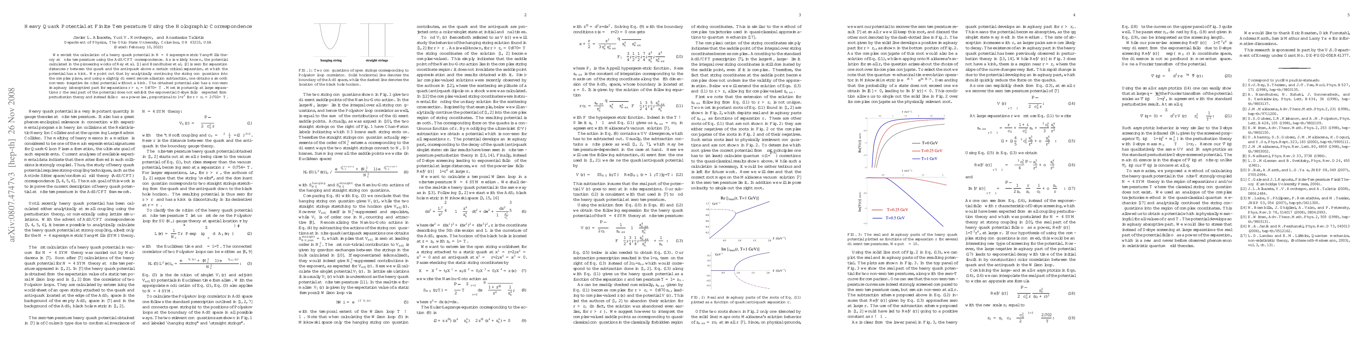 This paper revisits the calculation of the heavy quark potential in N=4 supersymmetric Yang-Mills theory at finite temperature via the AdS/CFT correspondence, revealing a smooth non-zero potential without a kink by analytically continuing string configurations and employing a different renormalization subtraction. The potential exhibits a non-zero imaginary part for large separations and a power-law decay instead of the expected exponential falloff.