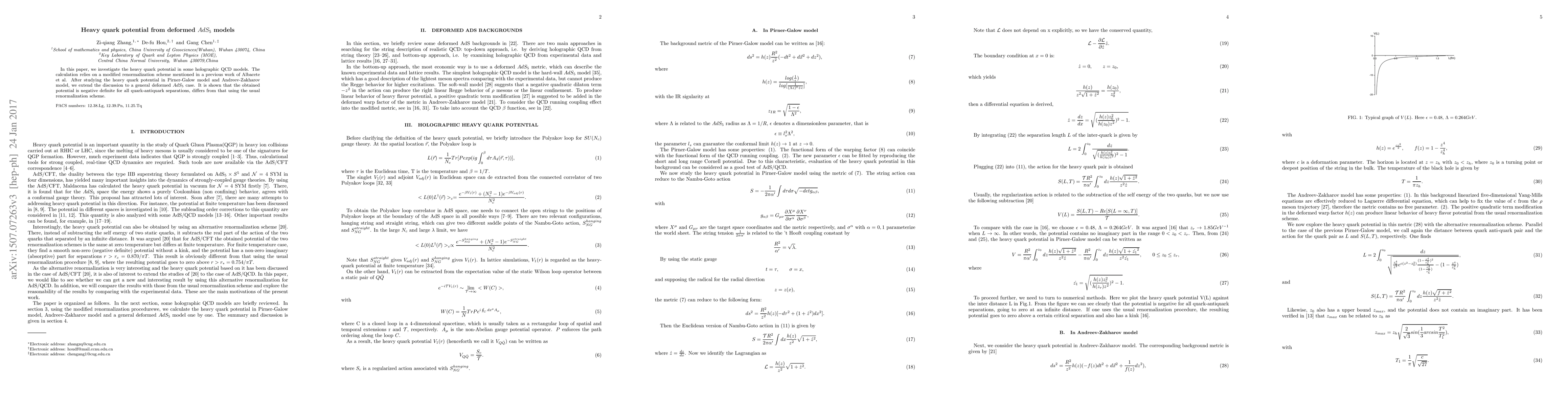 This paper examines the heavy quark potential in holographic QCD models, specifically the Pirner-Galow and Andreev-Zakharov models, using a modified renormalization scheme. It concludes that the potential is consistently negative for all separations, differing from results obtained with standard renormalization methods.