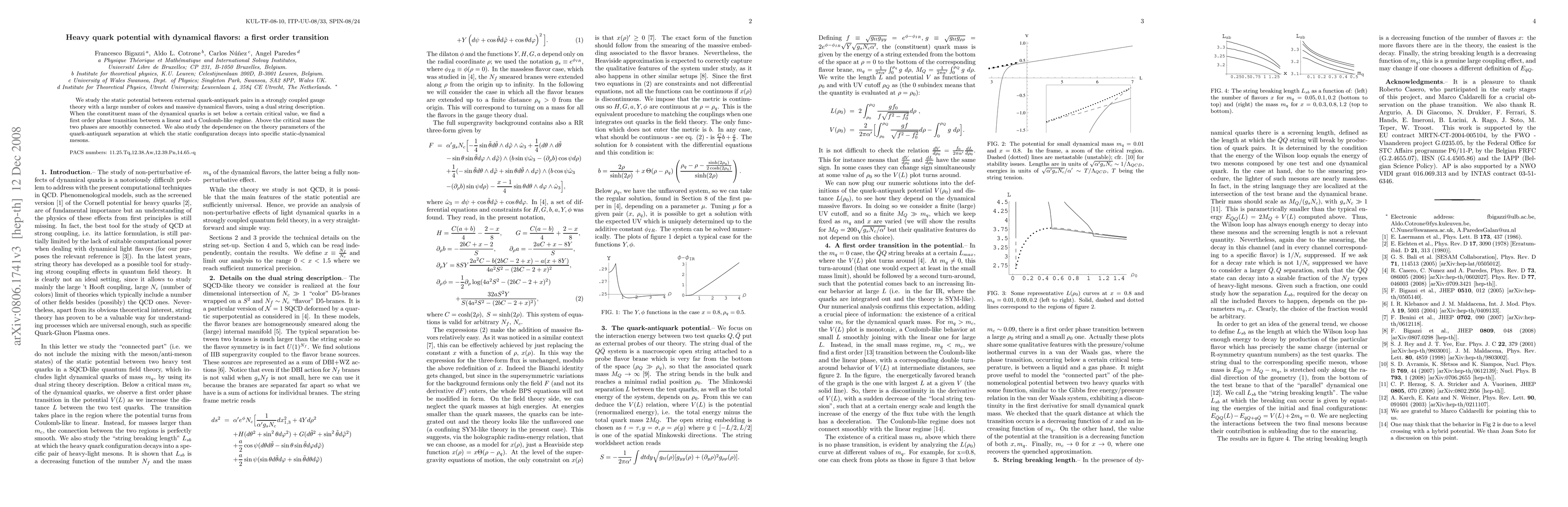 This study explores a strongly coupled gauge theory with massive dynamical flavors, revealing a first order phase transition in the static quark-antiquark potential below a critical dynamical quark mass, transitioning from linear to Coulomb-like behavior. Above the critical mass, the transition is smooth. The research also examines the influence of theory parameters on the separation where static configurations decay into static-dynamical mesons.