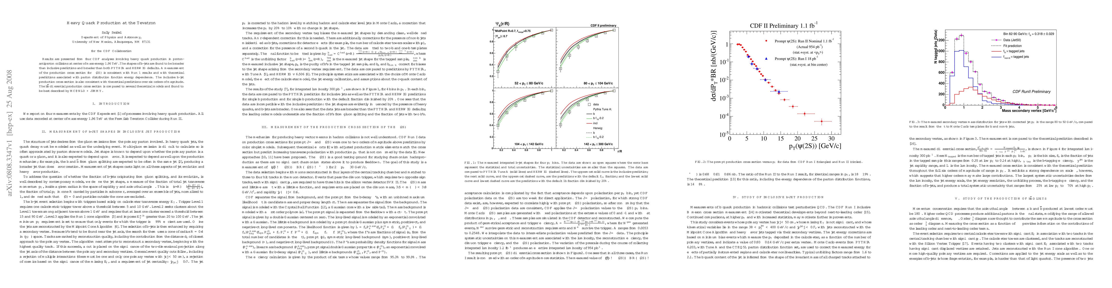 Results are presented from four CDF analyses involving heavy quark production in proton-antiproton collisions at center of mass energy 1.96 TeV. The shapes of b-jets are found to be broader than inclusive predictions and broader than both PYTHIA and HERWIG defaults. A measurement of the production cross section for psi(2S) is consistent with Run 1 results and with theoretical predictions associated with parton distribution function energy dependence. The inclusive b-jet production cross section is also consistent with theoretical predictions over six orders of magnitude. The b-bbar differential production cross section is compared to several theoretical models and found to be best described by MC@NLO + JIMMY.