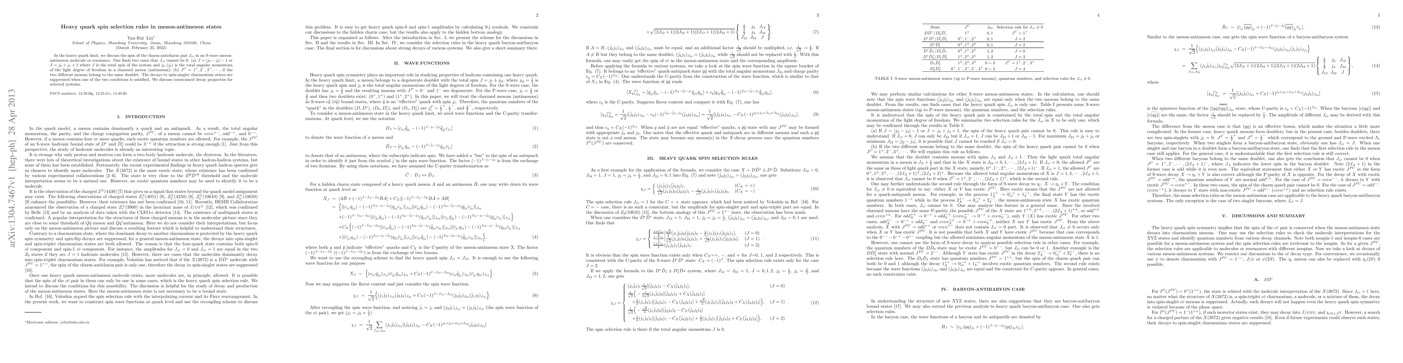 In the heavy quark limit, we discuss the spin of the charm-anticharm pair $J_{c\bar{c}}$ in an S-wave meson-antimeson molecule or resonance. One finds two cases that $J_{c\bar{c}}$ cannot be 0: (a) $J=|j_2-j_4|-1$ or $J=j_2+j_4+1$ where $J$ is the total spin of the system and $j_2$ ($j_4$) is the total angular momentum of the light degree of freedom in a charmed meson (antimeson); (b) $J^C=1^+,2^-,3^+,...$, if the two different mesons belong to the same doublet. The decays to spin-singlet charmonium states are suppressed when one of the two conditions is satisfied. We discuss constrained decay properties for selected systems.