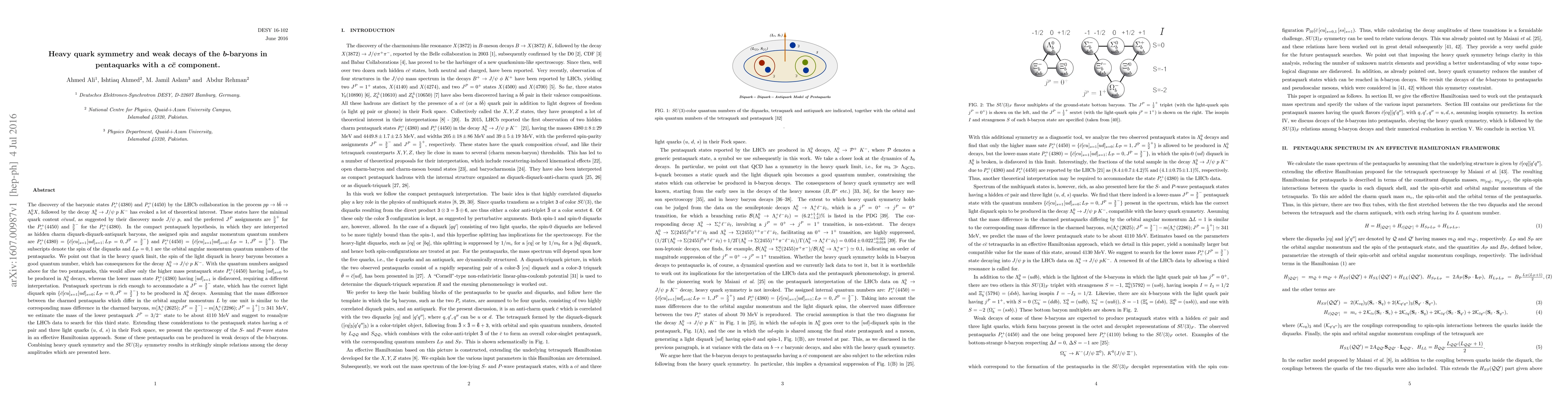 The discovery of the baryonic states $P_c^+(4380)$ and $P_c^+(4450)$ by the LHCb collaboration has evoked a lot of theoretical interest. These states have the minimal quark content $c \bar{c} u u d$. Interpreted as hidden charm diquark-diquark-antiquark baryons, the assigned spin and angular momentum quantum numbers are $P_c^+(4380)= \{\bar{c} [cu]_{s=1} [ud]_{s=1}; L_{\mathcal{P}}=0, J^{\rm P}=\frac{3}{2}^- \}$ and $P_c^+(4450)= \{\bar{c} [cu]_{s=1} [ud]_{s=0}; L_{\mathcal{P}}=1, J^{\rm P}=\frac{5}{2}^+ \}$, where $s=0,1$ are the spins of the diquarks and $L_{\mathcal{P}}=0,1$ are the orbital angular momentum quantum numbers of the pentaquarks. We point out that heavy quark symmetry allows only the higher mass pentaquark state $P_c^+(4450)$ having $[ud]_{s=0}$ to be produced in $\Lambda_b^0$ decays, whereas the lower mass state $P_c^+(4380)$ having $[ud]_{s=1}$ is disfavored. Pentaquark spectrum is rich enough to accommodate a $J^P=\frac{3}{2}^-$ state, which has the correct light diquark spin $\{\bar{c} [cu]_{s=1} [ud]_{s=0}; L_{\mathcal{P}}=0, J^{\rm P}=\frac{3}{2}^- \}$ to be produced in $\Lambda_b^0$ decays. Assuming that the orbital mass difference between the charmed pentaquarks is similar to the corresponding mass difference in the charmed baryons, we estimate the mass of the lower pentaquark $J^P=3/2^-$ state to be about 4110 MeV and suggest to reanalyze the LHCb data to search for this third state. We present the spectroscopy of the $S$- and $P$-wave pentaquark states having a $c\bar{c}$ pair and three light quarks using an effective Hamiltonian approach. Some of these pentaquarks can be produced in weak decays of the $b$-baryons. Combining heavy quark symmetry and the $SU(3)_F$ symmetry results in strikingly simple relations among the decay amplitudes which are presented here.
