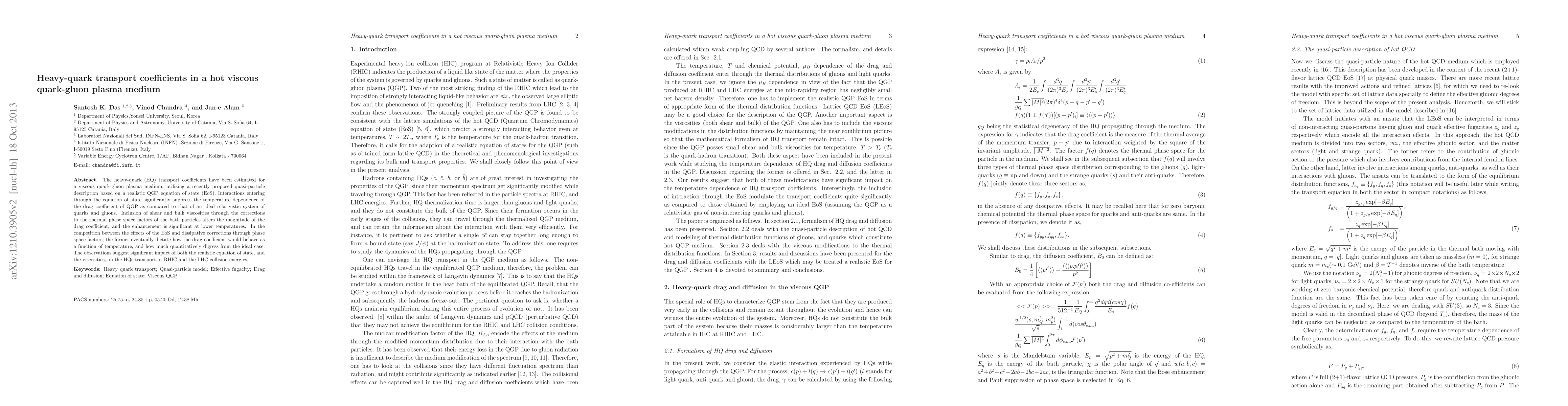 The heavy-quark (HQ) transport coefficients have been estimated for a viscous quark-gluon plasma medium, utilizing a recently proposed quasi-particle description based on realistic QGP equation of state (EoS). Interactions entering through the equation of state significantly suppress the temperature dependence of the drag coefficient of QGP as compared to that of an ideal system of quarks and gluons. Inclusion of shear and bulk viscosities through the corrections to the thermal phase space factors of the bath particles alters the magnitude of the drag coefficient and the enhancement is significant at lower temperatures. The competition between the effects of realistic EoS and dissipative corrections through phase space factor the former eventually dictate how the drag coefficient would behave as a function of temperature, and how much quantitatively digress from the ideal case. The observations suggest significant impact of both the realistic equation of state, and the viscosities, on the HQs transport at RHIC and the LHC collision energies.