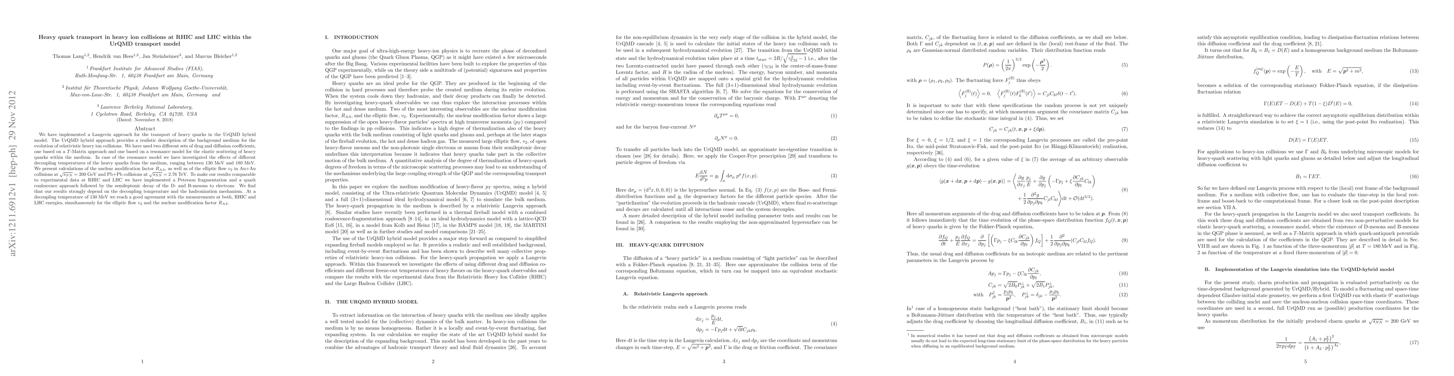 This paper implements a Langevin approach for heavy quark transport within the UrQMD hybrid model, comparing results from $T$-Matrix and resonance models. The study finds that decoupling temperatures of heavy quarks significantly affect the nuclear modification factor $R_{AA}$ and elliptic flow $v_2$, achieving good agreement with experimental data at RHIC and LHC energies when decoupling occurs at $130\,\text{MeV}$.