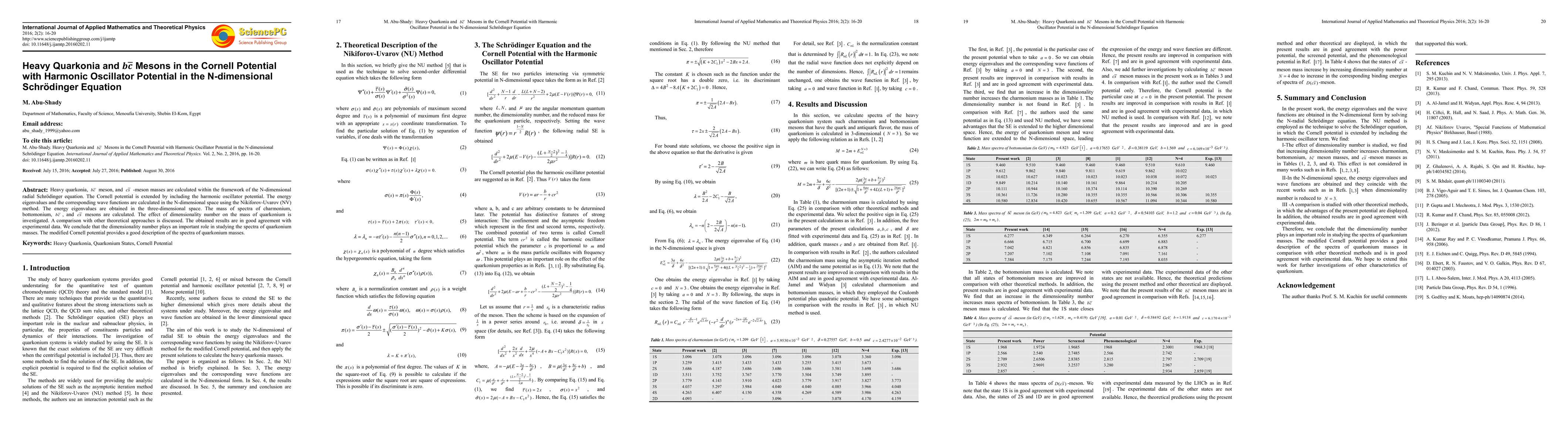 Heavy quarkonia, Bc-meson, and CS-meson masses are calculated within the framework of the N-dimensional radial Schrodinger equation. The Cornell potential is extended by including the harmonic oscillator potential. The energy eigenvalues and the corresponding wave functions are calculated in the N-dimensional space using the Nikiforov-Uvarov (NV) method. The energy eigenvalues are obtained in the three-dimensional space. The mass of spectra of charmonium, bottomonium, and mesons are calculated. The effect of dimensionality number on the mass of quarkonium is investigated. A comparison with other theoretical approaches is discussed. The obtained results are in good agreement with experimental data. We conclude that the dimensionality number plays an important role in studying the spectra of quarkonium masses. The modified Cornell potential provides a good description of the spectra of quarkonium masses.