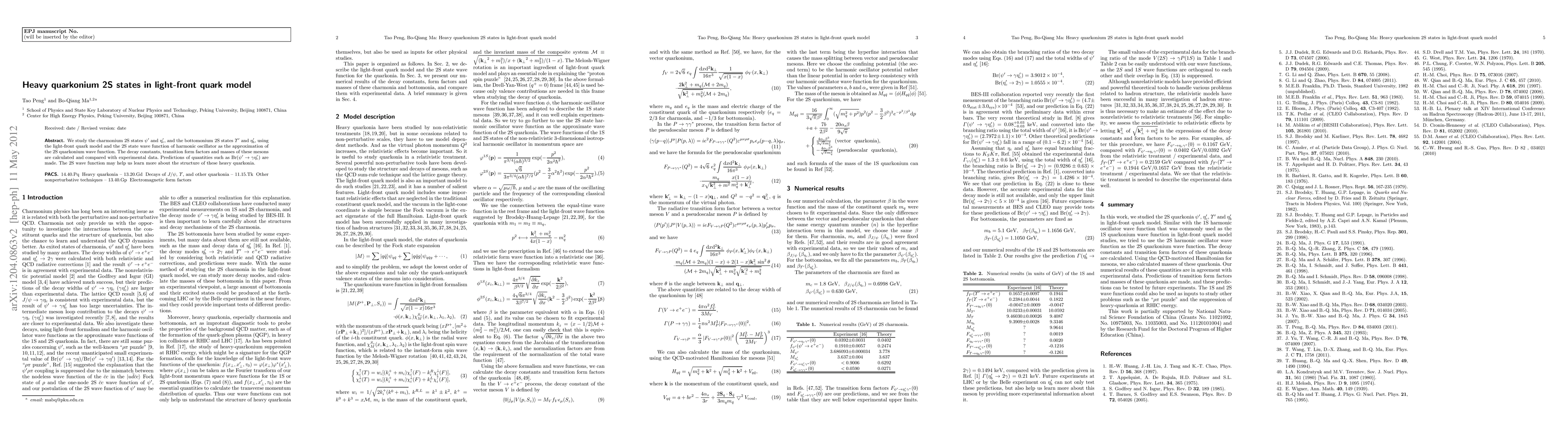 This paper investigates charmonium and bottomonium 2S states using the light-front quark model, calculating decay constants, transition form factors, and masses, and compares these with experimental data. Predictions for decay processes like Br($\psi' \to \gamma \eta_c'$) are provided, aiming to enhance understanding of the structure of heavy quarkonium.