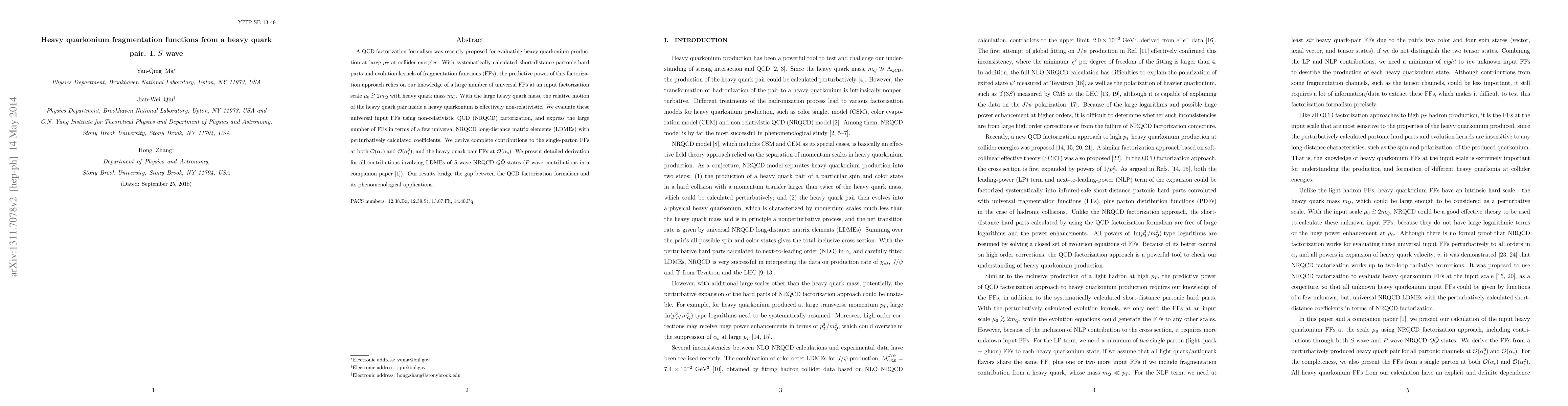 A QCD factorization formalism was recently proposed for evaluating heavy quarkonium production at large $p_T$ at collider energies. With systematically calculated short-distance partonic hard parts and evolution kernels of fragmentation functions (FFs), the predictive power of this factorization approach relies on our knowledge of a large number of universal FFs at an input factorization scale $\mu_0\gtrsim 2m_Q$ with heavy quark mass $m_Q$. With the large heavy quark mass, the relative motion of the heavy quark pair inside a heavy quarkonium is effectively non-relativistic. We evaluate these universal input FFs using non-relativistic QCD (NRQCD) factorization, and express the large number of FFs in terms of a few universal NRQCD long-distance matrix elements (LDMEs) with perturbatively calculated coefficients. We derive complete contributions to the single-parton FFs at both ${\cal O}(\alpha_s)$ and ${\cal O}(\alpha_s^2)$, and the heavy quark pair FFs at ${\cal O}(\alpha_s)$. We present detailed derivation for all contributions involving LDMEs of $S$-wave NRQCD $Q\bar{Q}$-states ($P$-wave contributions in a companion paper). Our results bridge the gap between the QCD factorization formalism and its phenomenological applications.