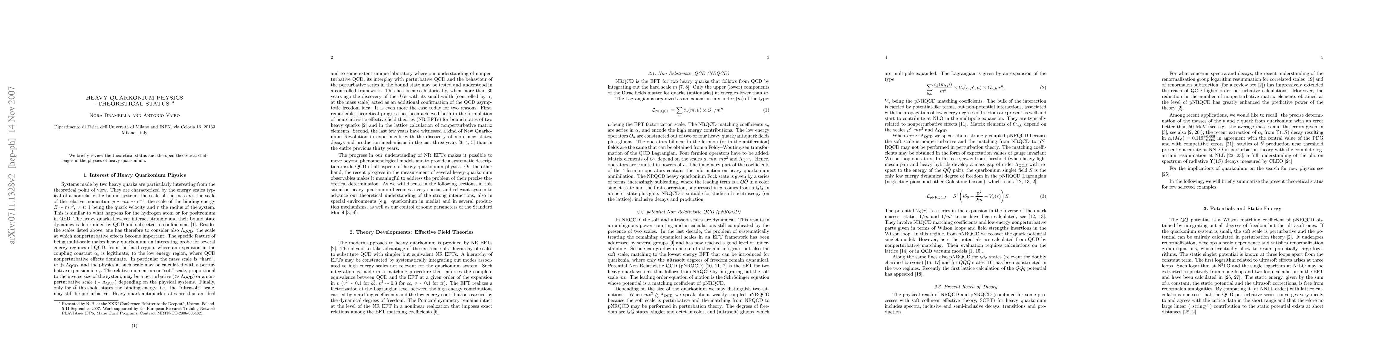 We briefly review the theoretical status and the open theoretical challenges in the physics of heavy quarkonium.