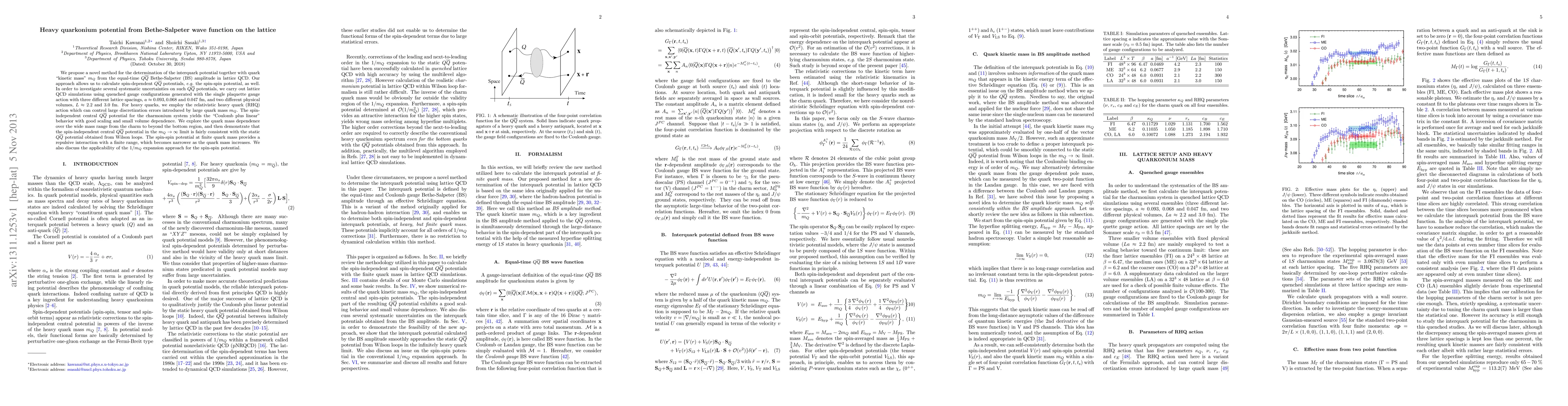 We propose a novel method for the determination of the interquark potential together with quark "kinetic mass'' $m_Q$ from the equal-time $Q\bar{Q}$ Bethe-Salpeter (BS) amplitude in lattice QCD. Our approach allows us to calculate spin-dependent $Q\bar{Q}$ potentials, e.g. the spin-spin potential, as well. In order to investigate several systematic uncertainties on such $Q\bar{Q}$ potentials, we carry out lattice QCD simulations using quenched gauge configurations generated with the single plaquette gauge action with three different lattice spacings, $a \approx$ 0.093, 0.068 and 0.047 fm, and two different physical volumes, $L \approx$ 2.2 and 3.0 fm. For heavy quarks, we employ the relativistic heavy quark (RHQ) action which can control large discretization errors introduced by large quark mass $m_Q$. The spin-independent central $Q\bar{Q}$ potential for the charmonium system yields the "Coulomb plus linear'' behavior with good scaling and small volume dependence. We explore the quark mass dependence over the wide mass range from the charm to beyond the bottom region, and then demonstrate that the spin-independent central $Q\bar{Q}$ potential in the $m_Q \to \infty$ limit is fairly consistent with the static $Q\bar{Q}$ potential obtained from Wilson loops. The spin-spin potential at finite quark mass provides a repulsive interaction with a finite range, which becomes narrower as the quark mass increases. We also discuss the applicability of the $1/m_Q$ expansion approach for the spin-spin potential.