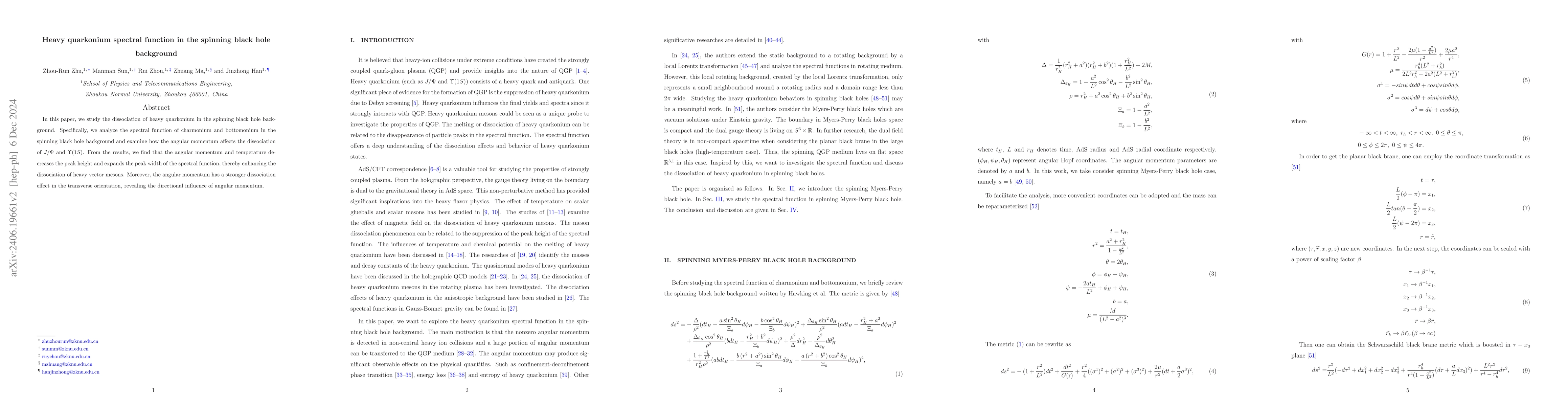 This paper investigates the dissociation of heavy quarkonium in a spinning black hole background, finding that angular momentum reduces peak height and broadens the spectral function of charmonium and bottomonium, thereby enhancing dissociation, with a stronger effect in transverse orientation.