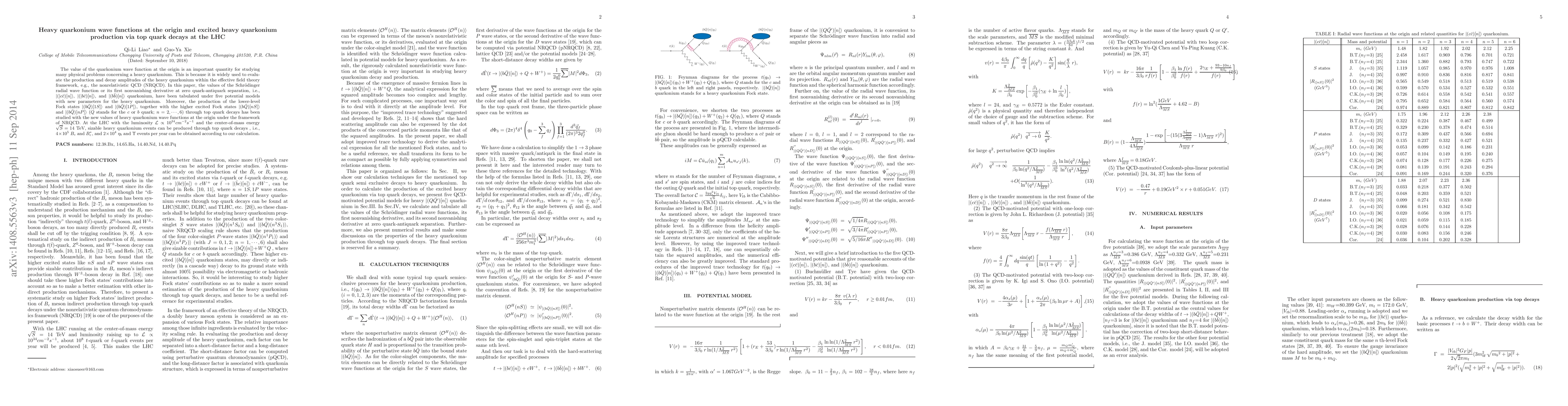 The value of quarkonium wave function at the origin is an important quantity while studying many physical problems concerning a heavy quarkonium. This is because that it is widely used to evaluate the production and decay amplitudes of the heavy quarkonium within the effective filed theory framework, e.g., the non-relativistic QCD (NRQCD). In this paper, the value of the Schr${\rm \ddot{o}}$dinger radial wave function or its first nonvanishing derivative at zero quark-antiquark separation, i.e., $|(|c\bar{c})[n]\rangle$-, $|(|b\bar{c})[n]\rangle$-, and $|(b\bar{b})[n]\rangle$-quarkonium, have been tabulated under five potential models with new parameters of the heavy quarkonium. Moreover, the production of the lower-level Fock states $|(b\bar{Q})[1S]\rangle$ and $|(b\bar{Q})[1P]\rangle$, together with the higher excited Fock states $|(b\bar{Q})[nS]\rangle$ and $|(b\bar{Q})[nP]\rangle$ ($Q$ stands for $c$- or $b$-quark; $n=2,\cdots,6 $) through top quark decays have been studied with the new values of heavy quarkonium wave functions at the origin under the framework of NRQCD. At the LHC with the luminosity ${\cal L}\propto 10^{34}cm^{-2}s^{-1}$ and the center-of-mass energy $\sqrt{S}=14$ TeV, sizable heavy quarkonium events can be produced through top quark decays, i.e., $4 \times10^5$ $B_c$ and $B^*_c$, and $2 \times10^4$ $\eta_b$ and $\Upsilon$ events per year can be obtained according to our calculation.