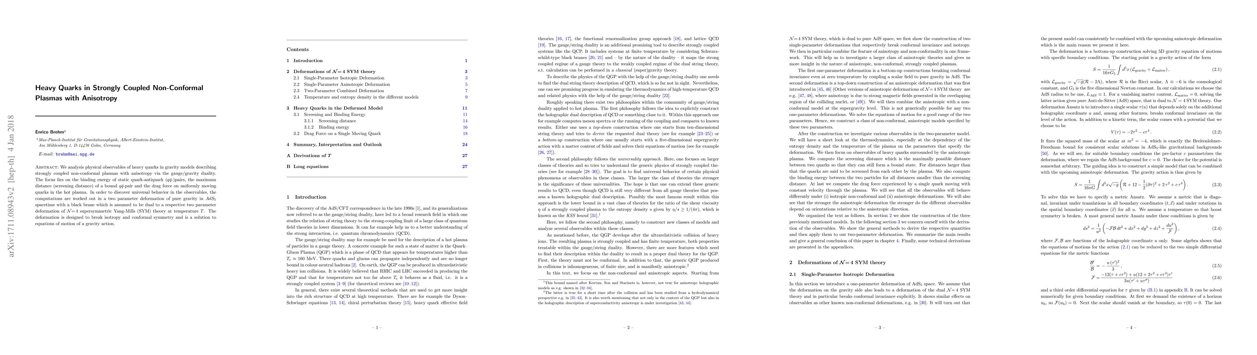We analysis physical observables of heavy quarks in gravity models describing strongly coupled non-conformal plasmas with anisotropy via the gauge/gravity duality. The focus lies on the binding energy of static quark-antiquark $(q\bar q$-)pairs, the maximum distance (screening distance) of a bound $q\bar q$-pair and the drag force on uniformly moving quarks in the hot plasma. In order to discover universal behavior in the observables, the computations are worked out in a two parameter deformation of pure gravity in $AdS_5$ spacetime with a black brane which is assumed to be dual to a respective two parameter deformation of $\mathcal{N}$=\,4 supersymmetric Yang-Mills (SYM) theory at temperature $T$. The deformation is designed to break isotropy and conformal symmetry and is a solution to equations of motion of a gravity action.