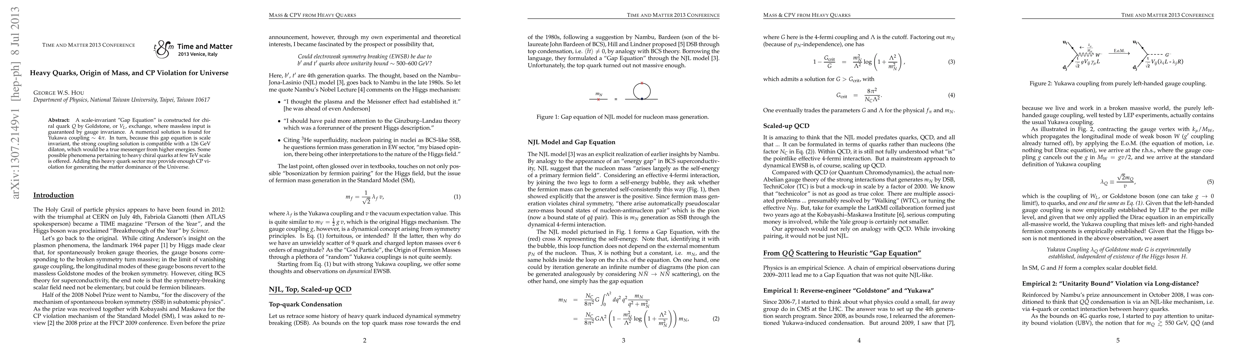A scale-invariant "Gap Equation" is constructed for chiral quark $Q$ by Goldstone, or $V_L$, exchange, where massless input is guaranteed by gauge invariance. A numerical solution is found for Yukawa coupling $\sim 4\pi$. In turn, because this gap equation is scale invariant, the strong coupling solution is compatible with a 126 GeV dilaton, which would be a true messenger from higher energies. Some possible phenomena pertaining to heavy chiral quarks at few TeV scale is offered. Adding this heavy quark sector may provide enough CP violation for generating the matter dominance of the Universe.