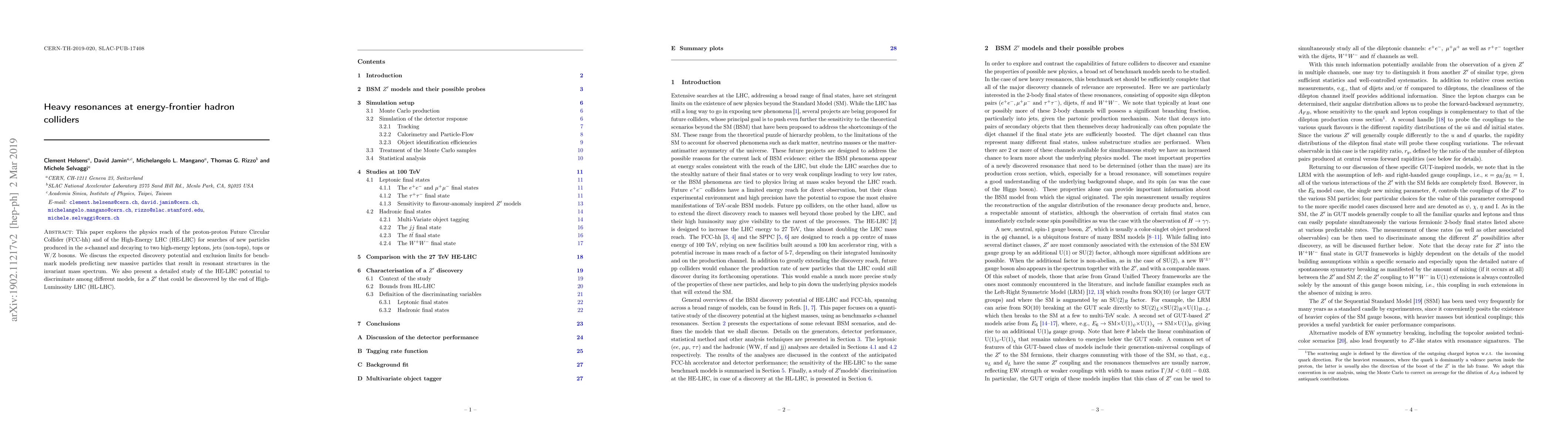 This paper explores the physics reach of the proton-proton Future Circular Collider (FCC-hh) and of the High-Energy LHC (HE-LHC) for searches of new particles produced in the $s$-channel and decaying to two high-energy leptons, jets (non-tops), tops or W/Z bosons. We discuss the expected discovery potential and exclusion limits for benchmark models predicting new massive particles that result in resonant structures in the invariant mass spectrum. We also present a detailed study of the HE-LHC potential to discriminate among different models, for a $Z'$ that could be discovered by the end of High-Luminosity LHC (HL-LHC).