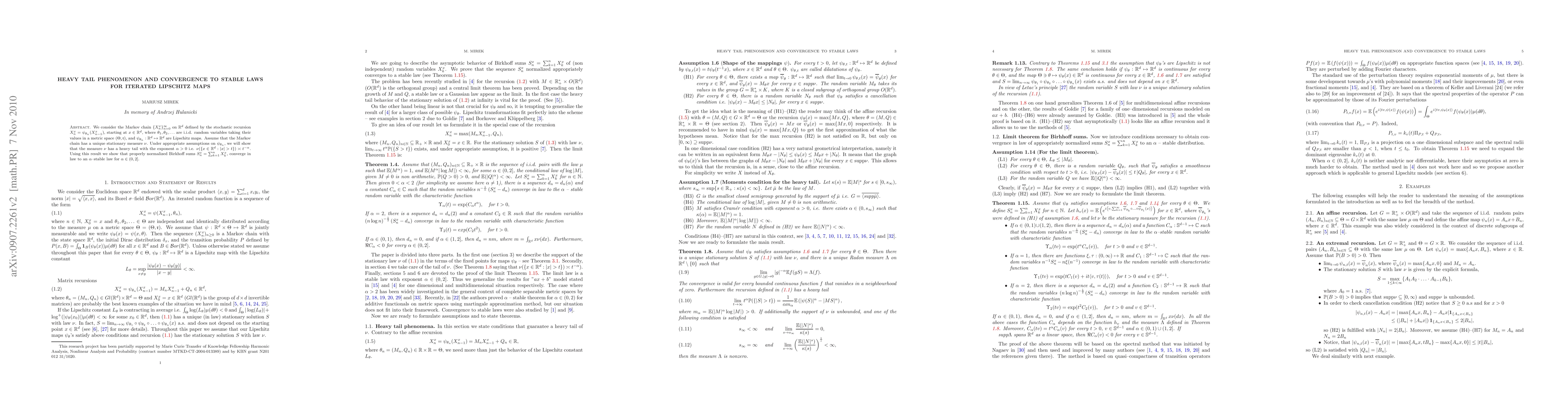 We consider the Markov chain $\{X_n^x\}_{n=0}^\infty$ on $\R^d$ defined by the stochastic recursion $X_{n}^{x}=\p_{\theta_{n}}(X_{n-1}^{x})$, starting at $x\in\R^d$, where $\theta_{1}, \theta_{2},...$ are i.i.d. random variables taking their values in a metric space $(\Theta, \mathfrak{r}),$ and $\p_{\theta_{n}}:\R^d\mapsto\R^d$ are Lipschitz maps. Assume that the Markov chain has a unique stationary measure $\nu$. Under appropriate assumptions on $\p_{\theta_n}$, we will show that the measure $\nu$ has a heavy tail with the exponent $\alpha>0$ i.e. $\nu(\{x\in\R^d: |x|>t\})\asymp t^{-\alpha}$. Using this result we show that properly normalized Birkhoff sums $S_n^x=\sum_{k=1}^n X_k^x$, converge in law to an $\alpha$--stable law for $\alpha\in(0, 2]$.