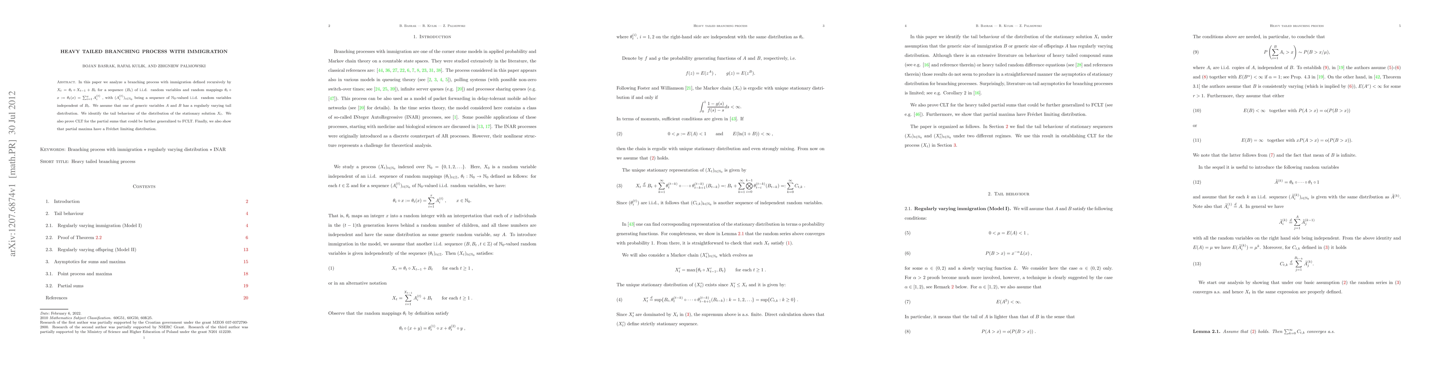 In this paper we analyze a branching process with immigration defined recursively by $X_t=\theta_t\circ X_{t-1}+B_t$ for a sequence $(B_t)$ of i.i.d. random variables and random mappings $ \theta_t\circ x:=\theta_t(x)=\sum_{i=1}^xA_i^{(t)}, $ with $(A_i^{(t)})_{i\in \mathbb{N}_0}$ being a sequence of $\mathbb{N}_0$-valued i.i.d. random variables independent of $B_t$. We assume that one of generic variables $A$ and $B$ has a regularly varying tail distribution. We identify the tail behaviour of the distribution of the stationary solution $X_t$. We also prove CLT for the partial sums that could be further generalized to FCLT. Finally, we also show that partial maxima have a Fr\'echet limiting distribution.