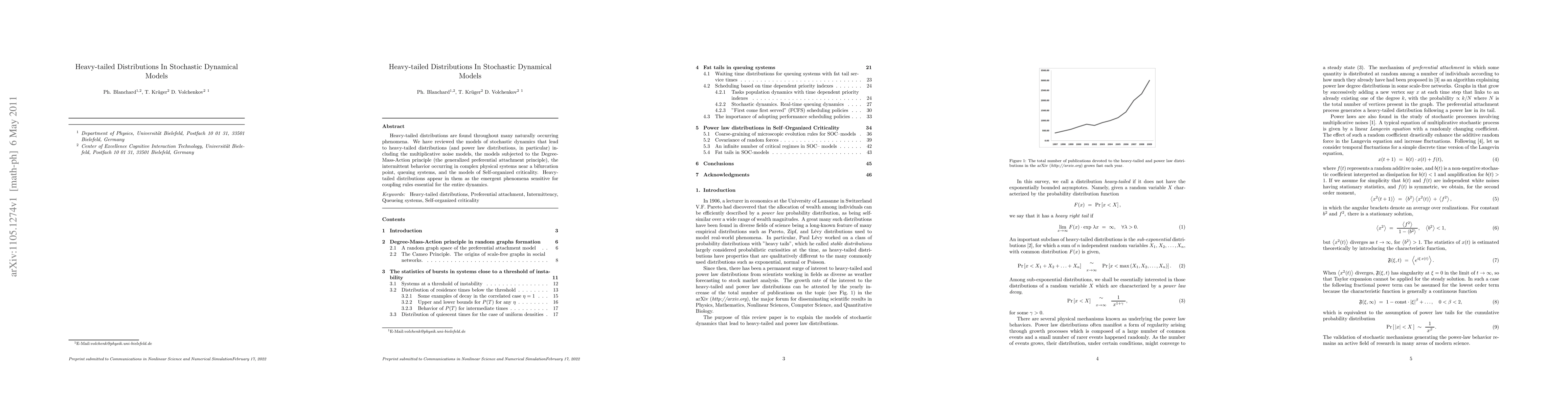 Heavy-tailed distributions are found throughout many naturally occurring phenomena. We have reviewed the models of stochastic dynamics that lead to heavy-tailed distributions (and power law distributions, in particular) including the multiplicative noise models, the models subjected to the Degree-Mass-Action principle (the generalized preferential attachment principle), the intermittent behavior occurring in complex physical systems near a bifurcation point, queuing systems, and the models of Self-organized criticality. Heavy-tailed distributions appear in them as the emergent phenomena sensitive for coupling rules essential for the entire dynamics.