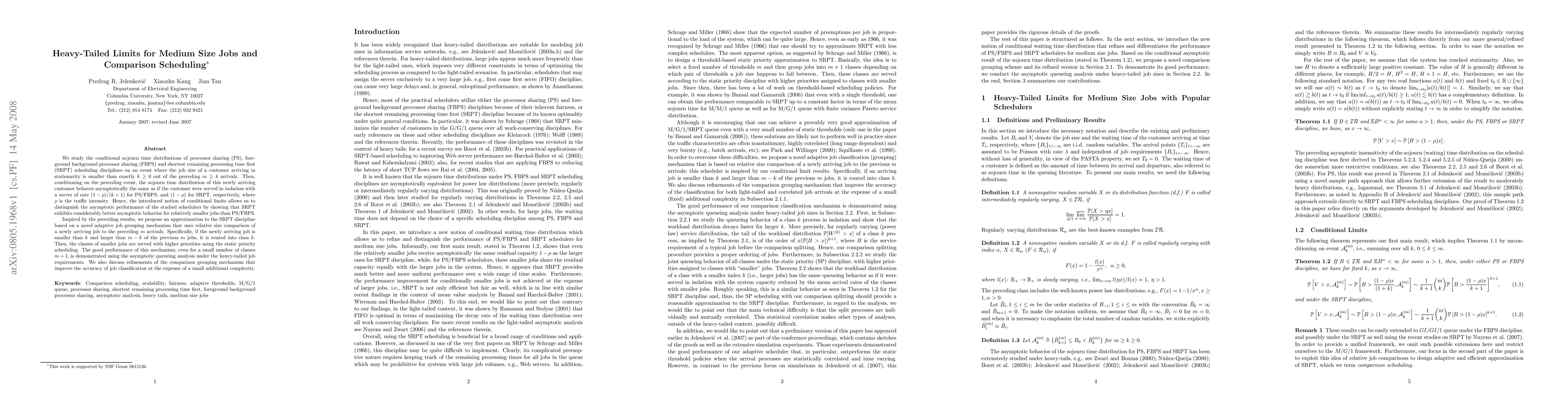 We study the conditional sojourn time distributions of processor sharing (PS), foreground background processor sharing (FBPS) and shortest remaining processing time first (SRPT) scheduling disciplines on an event where the job size of a customer arriving in stationarity is smaller than exactly k>=0 out of the preceding m>=k arrivals. Then, conditioning on the preceding event, the sojourn time distribution of this newly arriving customer behaves asymptotically the same as if the customer were served in isolation with a server of rate (1-\rho)/(k+1) for PS/FBPS, and (1-\rho) for SRPT, respectively, where \rho is the traffic intensity. Hence, the introduced notion of conditional limits allows us to distinguish the asymptotic performance of the studied schedulers by showing that SRPT exhibits considerably better asymptotic behavior for relatively smaller jobs than PS/FBPS. Inspired by the preceding results, we propose an approximation to the SRPT discipline based on a novel adaptive job grouping mechanism that uses relative size comparison of a newly arriving job to the preceding m arrivals. Specifically, if the newly arriving job is smaller than k and larger than m-k of the previous m jobs, it is routed into class k. Then, the classes of smaller jobs are served with higher priorities using the static priority scheduling. The good performance of this mechanism, even for a small number of classes m+1, is demonstrated using the asymptotic queueing analysis under the heavy-tailed job requirements. We also discuss refinements of the comparison grouping mechanism that improve the accuracy of job classification at the expense of a small additional complexity.