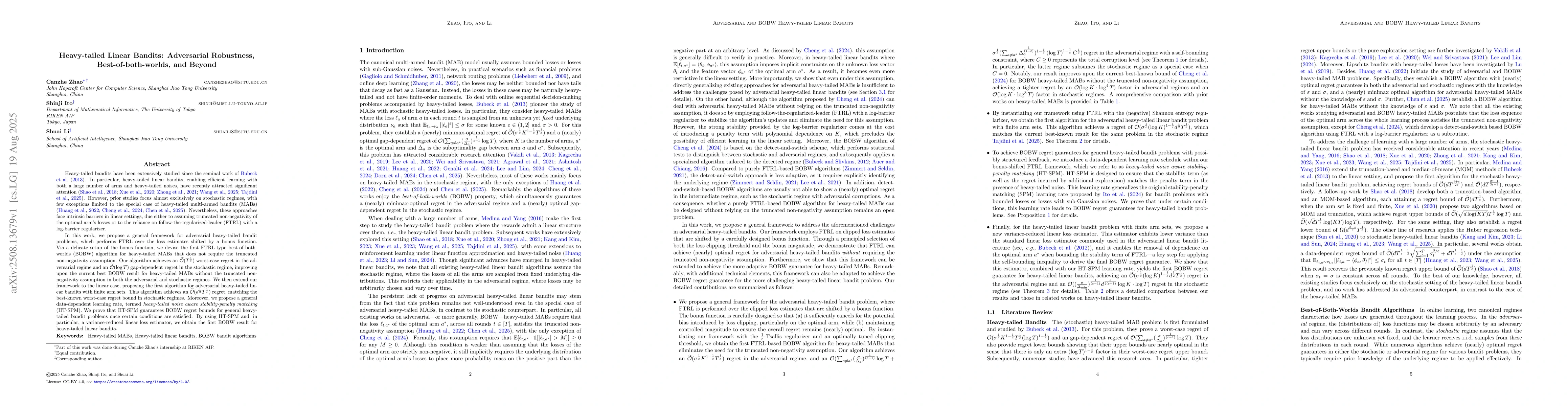 Heavy-tailed bandits have been extensively studied since the seminal work of \citet{Bubeck2012BanditsWH}. In particular, heavy-tailed linear bandits, enabling efficient learning with both a large number of arms and heavy-tailed noises, have recently attracted significant attention \citep{ShaoYKL18,XueWWZ20,ZhongHYW21,Wang2025heavy,tajdini2025improved}. However, prior studies focus almost exclusively on stochastic regimes, with few exceptions limited to the special case of heavy-tailed multi-armed bandits (MABs) \citep{Huang0H22,ChengZ024,Chen2024uniINF}. In this work, we propose a general framework for adversarial heavy-tailed bandit problems, which performs follow-the-regularized-leader (FTRL) over the loss estimates shifted by a bonus function. Via a delicate setup of the bonus function, we devise the first FTRL-type best-of-both-worlds (BOBW) algorithm for heavy-tailed MABs, which does not require the truncated non-negativity assumption and achieves an $\widetilde{O}(T^{\frac{1}{\varepsilon}})$ worst-case regret in the adversarial regime as well as an $\widetilde{O}(\log T)$ gap-dependent regret in the stochastic regime. We then extend our framework to the linear case, proposing the first algorithm for adversarial heavy-tailed linear bandits with finite arm sets. This algorithm achieves an $\widetilde{O}(d^{\frac{1}{2}}T^{\frac{1}{\varepsilon}})$ regret, matching the best-known worst-case regret bound in stochastic regimes. Moreover, we propose a general data-dependent learning rate, termed \textit{heavy-tailed noise aware stability-penalty matching} (HT-SPM). We prove that HT-SPM guarantees BOBW regret bounds for general heavy-tailed bandit problems once certain conditions are satisfied. By using HT-SPM and, in particular, a variance-reduced linear loss estimator, we obtain the first BOBW result for heavy-tailed linear bandits.