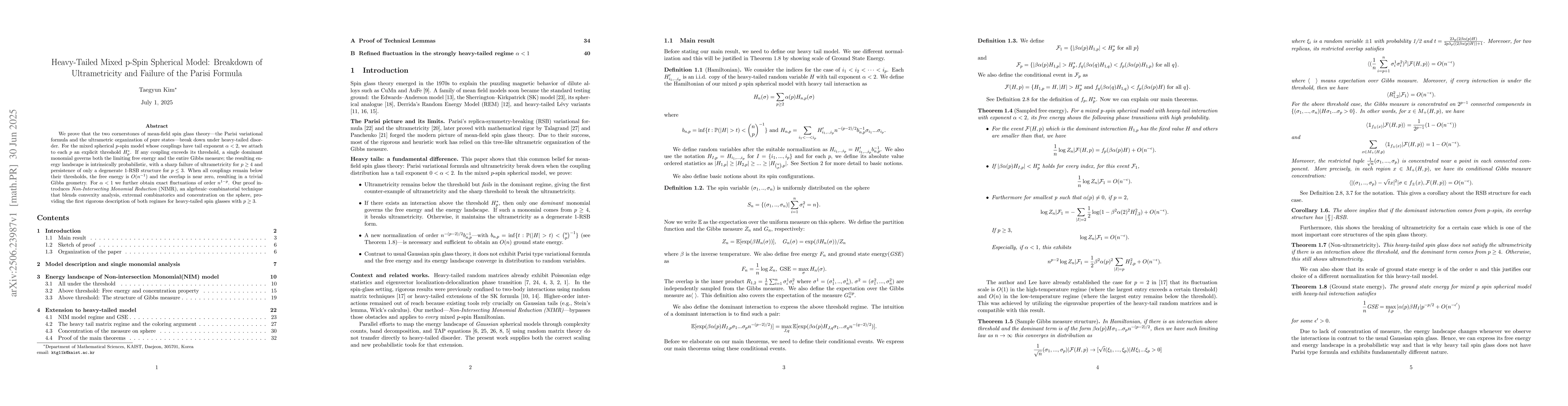 We prove that the two cornerstones of mean-field spin glass theory -- the Parisi variational formula and the ultrametric organization of pure states -- break down under heavy-tailed disorder. For the mixed spherical $p$-spin model whose couplings have tail exponent $\alpha<2$, we attach to each $p$ an explicit threshold $H_p^{*}$. If any coupling exceeds its threshold, a single dominant monomial governs both the limiting free energy and the entire Gibbs measure; the resulting energy landscape is intrinsically probabilistic, with a sharp failure of ultrametricity for $p\ge4$ and persistence of only a degenerate 1-RSB structure for $p\le3$. When all couplings remain below their thresholds, the free energy is $O(n^{-1})$ and the overlap is near zero, resulting in a trivial Gibbs geometry. For $\alpha<1$ we further obtain exact fluctuations of order $n^{1-p}$. Our proof introduces Non-Intersecting Monomial Reduction (NIMR), an algebraic-combinatorial technique that blends convexity analysis, extremal combinatorics and concentration on the sphere, providing the first rigorous description of both regimes for heavy-tailed spin glasses with $p\ge3$.