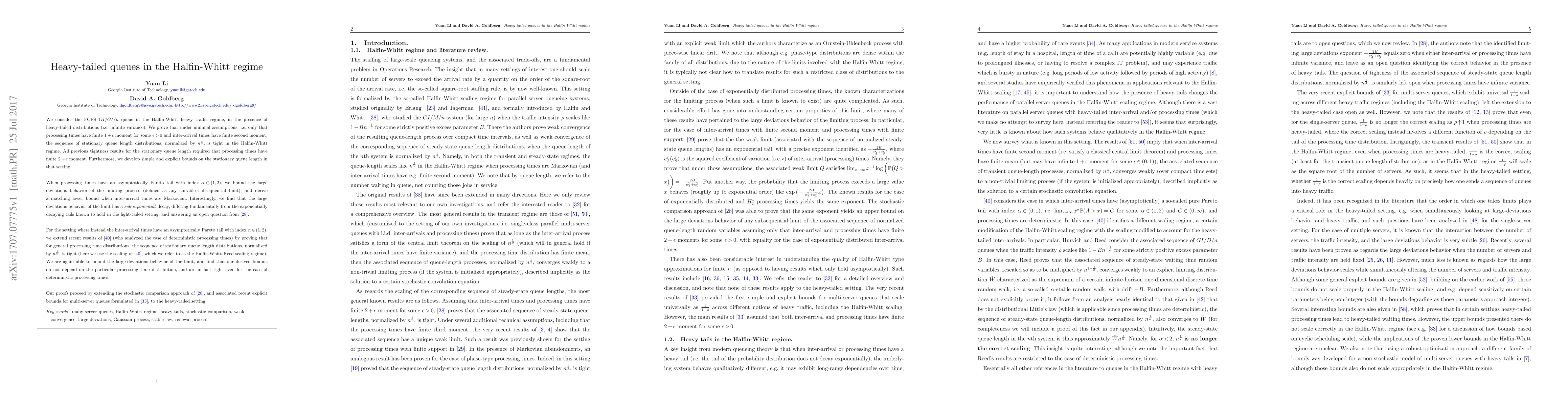 We consider the FCFS G/G/n queue in the Halfin-Whitt regime, in the presence of heavy-tailed distributions (i.e. infinite variance). We prove that under minimal assumptions, i.e. only that processing times have finite 1 + epsilon moment and inter-arrival times have finite second moment, the sequence of stationary queue length distributions, normalized by $n^{\frac{1}{2}}$, is tight. All previous tightness results for the stationary queue length required that processing times have finite 2 + epsilon moment. Furthermore, we develop simple and explicit bounds on the stationary queue length in that setting. When processing times have an asymptotically Pareto tail with index alpha in (1,2), we bound the large deviations behavior of the limiting process, and derive a matching lower bound when inter-arrival times are Markovian. Interestingly, we find that the large deviations behavior of the limit has a sub-exponential decay, differing fundamentally from the exponentially decaying tails known to hold in the light-tailed setting, and answering an open question of Gamarnik and Goldberg. For the setting where instead the inter-arrival times have an asymptotically Pareto tail with index alpha in (1,2), we extend recent results of Hurvich and Reed (who analyzed the case of deterministic processing times) by proving that for general processing time distributions, the sequence of stationary queue length distributions, normalized by $n^{\frac{1}{\alpha}}$, is tight (here we use the scaling of Hurvich and Reed, i.e. Halfin-Whitt-Reed regime). We are again able to bound the large-deviations behavior of the limit, and find that our derived bounds do not depend on the particular processing time distribution, and are in fact tight even for the case of deterministic processing times.