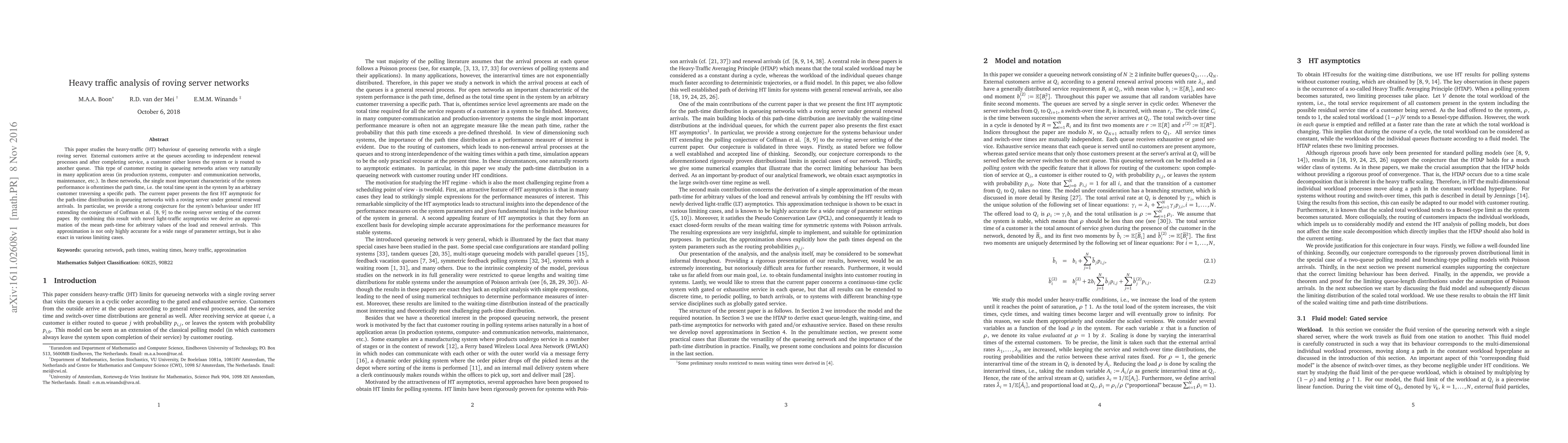This paper studies the heavy-traffic (HT) behaviour of queueing networks with a single roving server. External customers arrive at the queues according to independent renewal processes and after completing service, a customer either leaves the system or is routed to another queue. This type of customer routing in queueing networks arises very naturally in many application areas (in production systems, computer- and communication networks, maintenance, etc.). In these networks, the single most important characteristic of the system performance is oftentimes the path time, i.e. the total time spent in the system by an arbitrary customer traversing a specific path. The current paper presents the first HT asymptotic for the path-time distribution in queueing networks with a roving server under general renewal arrivals. In particular, we provide a strong conjecture for the system's behaviour under HT extending the conjecture of Coffman et al. [E.G. Coffman Jr., A.A. Puhalskii, M.I. Reiman 1995 and 1998] to the roving server setting of the current paper. By combining this result with novel light-traffic asymptotics we derive an approximation of the mean path-time for arbitrary values of the load and renewal arrivals. This approximation is not only highly accurate for a wide range of parameter settings, but is also exact in various limiting cases.