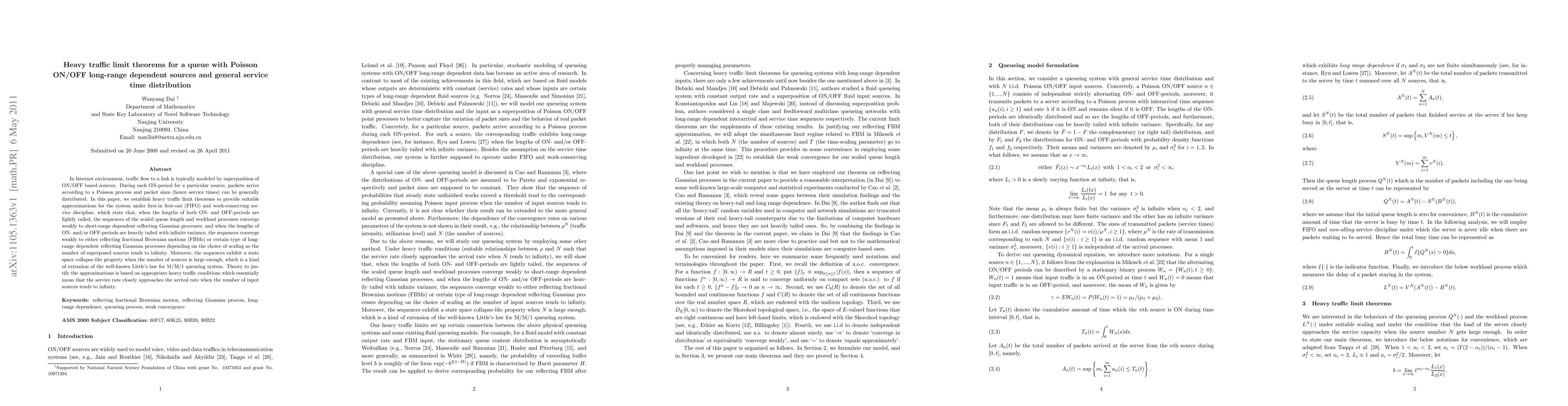 In Internet environment, traffic flow to a link is typically modeled by superposition of ON/OFF based sources. During each ON-period for a particular source, packets arrive according to a Poisson process and packet sizes (hence service times) can be generally distributed. In this paper, we establish heavy traffic limit theorems to provide suitable approximations for the system under first-in first-out (FIFO) and work conserving service discipline, which state that, when the lengths of both ON- and OFF-periods are lightly tailed, the sequences of the scaled queue length and workload processes converge weakly to short-range dependent reflecting Gaussian processes, and when the lengths of ON- and/or OFF periods are heavily tailed with infinite variance, the sequences converge weakly to either reflecting fractional Brownian motions (FBMs) or certain type of long-range dependent reflecting Gaussian processes depending on the choice of scaling as the number of superposed sources tends to infinity. Moreover, the sequences exhibit a state space collapse-like property when the number of sources is large enough, which is a kind of extension of the well-known Little's law for M/M/1 queueing system. Theory to justify the approximations is based on appropriate heavy traffic conditions which essentially mean that the service rate closely approaches the arrival rate when the number of input sources tends to infinity.
