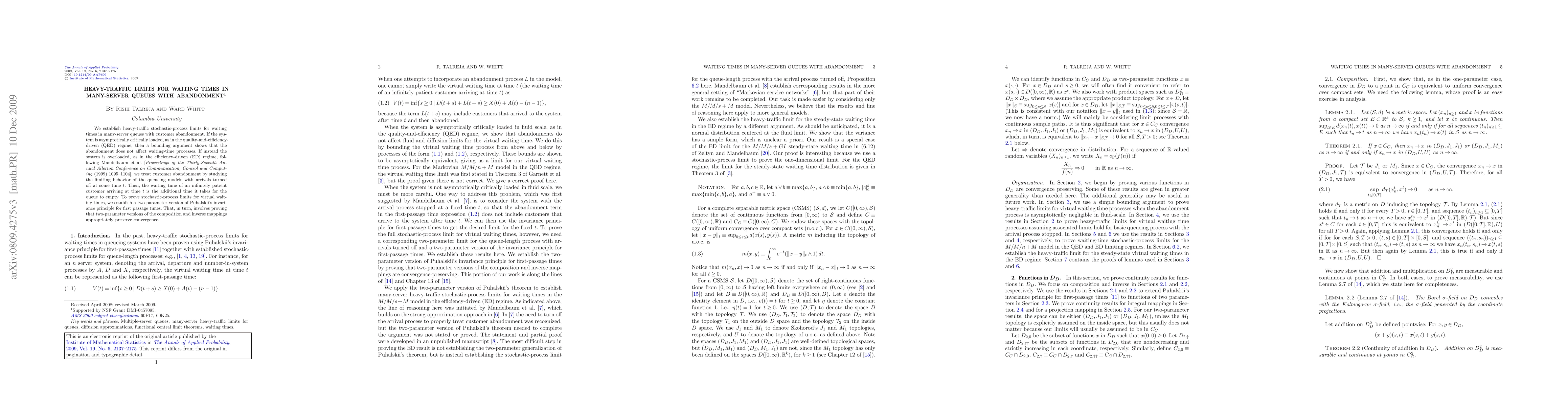 The paper establishes heavy-traffic stochastic-process limits for waiting times in many-server queues with customer abandonment using bounding arguments and a two-parameter version of Puhalskii's invariance principle.