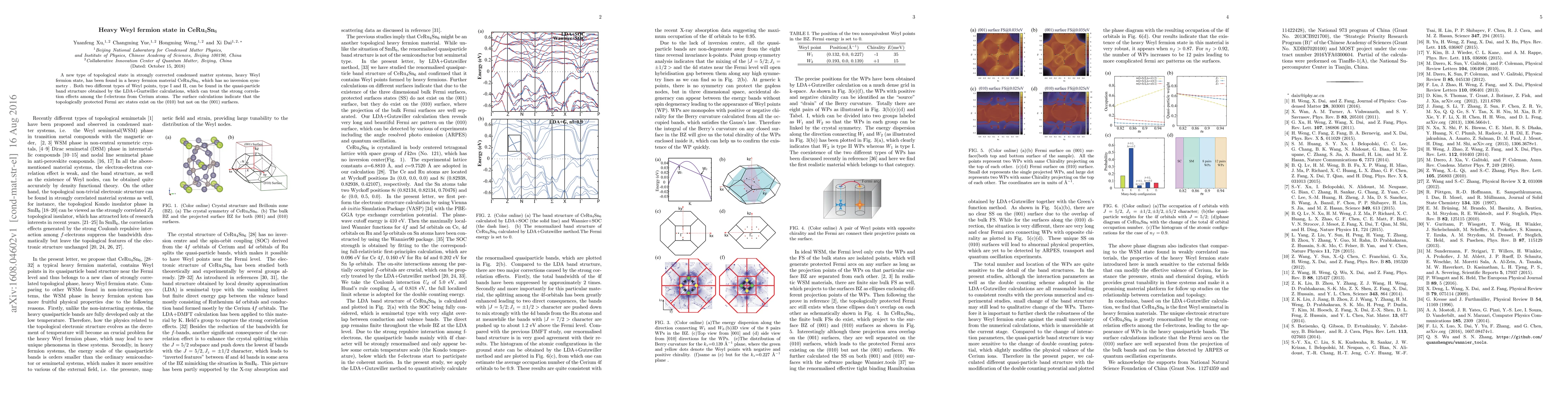 A new type of topological state in strongly corrected condensed matter systems, heavy Weyl fermion state, has been found in a heavy fermion material CeRu$_4$Sn$_6$, which has no inversion symmetry. Both two different types of Weyl points, type I and II, can be found in the quasi-particle band structure obtained by the LDA+Guztwiller calculations, which can treat the strong correlation effects among the f-electrons from Cerium atoms. The surface calculations indicate that the topologically protected Fermi arc states exist on the (010) but not on the (001) surfaces.
