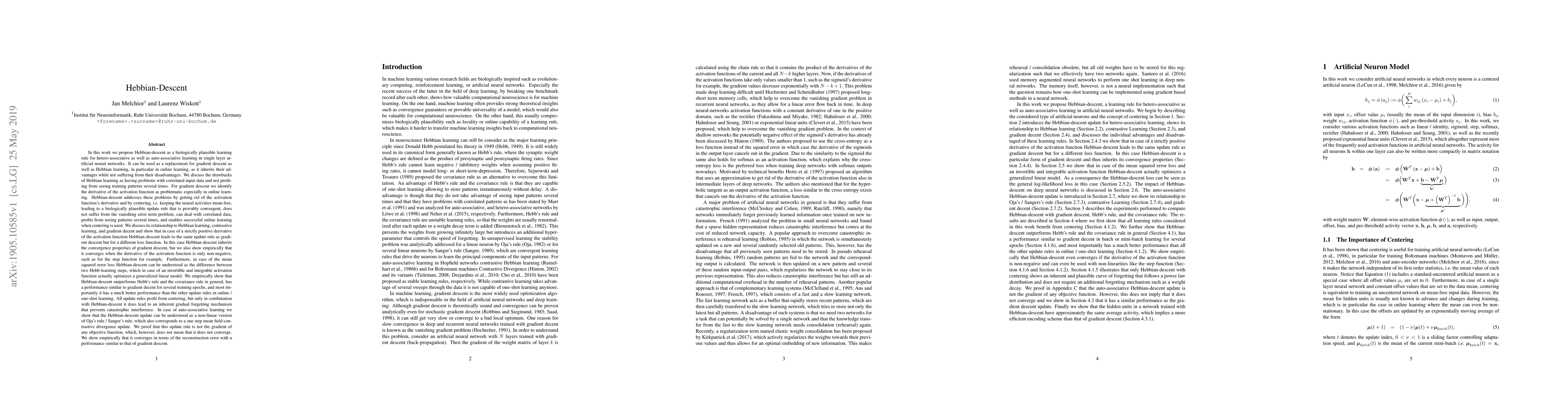 In this work we propose Hebbian-descent as a biologically plausible learning rule for hetero-associative as well as auto-associative learning in single layer artificial neural networks. It can be used as a replacement for gradient descent as well as Hebbian learning, in particular in online learning, as it inherits their advantages while not suffering from their disadvantages. We discuss the drawbacks of Hebbian learning as having problems with correlated input data and not profiting from seeing training patterns several times. For gradient descent we identify the derivative of the activation function as problematic especially in online learning. Hebbian-descent addresses these problems by getting rid of the activation function's derivative and by centering, i.e. keeping the neural activities mean free, leading to a biologically plausible update rule that is provably convergent, does not suffer from the vanishing error term problem, can deal with correlated data, profits from seeing patterns several times, and enables successful online learning when centering is used. We discuss its relationship to Hebbian learning, contrastive learning, and gradient decent and show that in case of a strictly positive derivative of the activation function Hebbian-descent leads to the same update rule as gradient descent but for a different loss function. In this case Hebbian-descent inherits the convergence properties of gradient descent, but we also show empirically that it converges when the derivative of the activation function is only non-negative, such as for the step function for example. Furthermore, in case of the mean squared error loss Hebbian-descent can be understood as the difference between two Hebb-learning steps, which in case of an invertible and integrable activation function actually optimizes a generalized linear model. ...