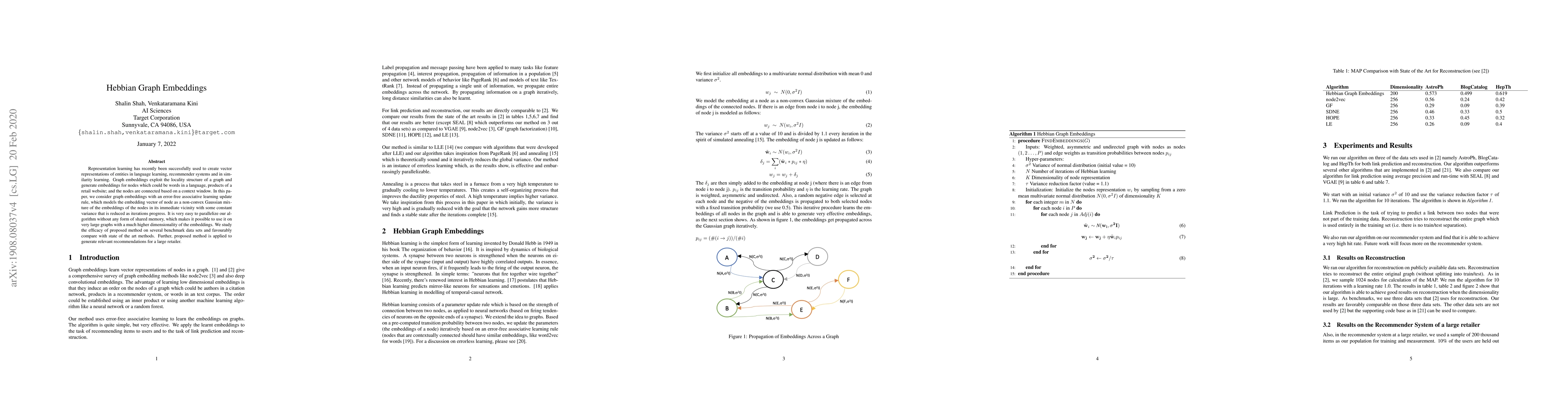 Representation learning has recently been successfully used to create vector representations of entities in language learning, recommender systems and in similarity learning. Graph embeddings exploit the locality structure of a graph and generate embeddings for nodes which could be words in a language, products of a retail website; and the nodes are connected based on a context window. In this paper, we consider graph embeddings with an error-free associative learning update rule, which models the embedding vector of node as a non-convex Gaussian mixture of the embeddings of the nodes in its immediate vicinity with some constant variance that is reduced as iterations progress. It is very easy to parallelize our algorithm without any form of shared memory, which makes it possible to use it on very large graphs with a much higher dimensionality of the embeddings. We study the efficacy of proposed method on several benchmark data sets and favorably compare with state of the art methods. Further, proposed method is applied to generate relevant recommendations for a large retailer.