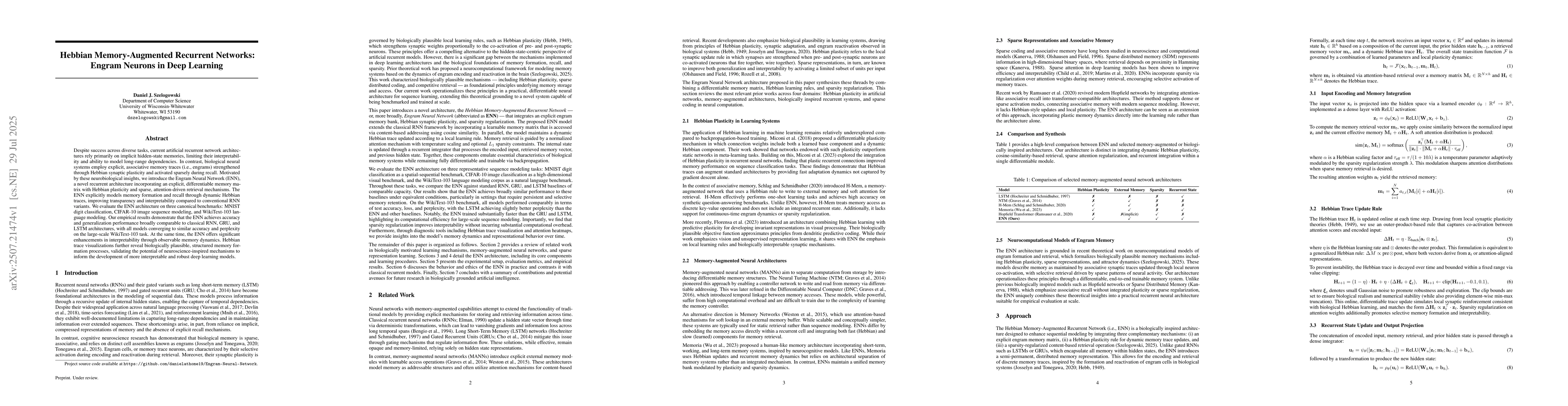 Despite success across diverse tasks, current artificial recurrent network architectures rely primarily on implicit hidden-state memories, limiting their interpretability and ability to model long-range dependencies. In contrast, biological neural systems employ explicit, associative memory traces (i.e., engrams) strengthened through Hebbian synaptic plasticity and activated sparsely during recall. Motivated by these neurobiological insights, we introduce the Engram Neural Network (ENN), a novel recurrent architecture incorporating an explicit, differentiable memory matrix with Hebbian plasticity and sparse, attention-driven retrieval mechanisms. The ENN explicitly models memory formation and recall through dynamic Hebbian traces, improving transparency and interpretability compared to conventional RNN variants. We evaluate the ENN architecture on three canonical benchmarks: MNIST digit classification, CIFAR-10 image sequence modeling, and WikiText-103 language modeling. Our empirical results demonstrate that the ENN achieves accuracy and generalization performance broadly comparable to classical RNN, GRU, and LSTM architectures, with all models converging to similar accuracy and perplexity on the large-scale WikiText-103 task. At the same time, the ENN offers significant enhancements in interpretability through observable memory dynamics. Hebbian trace visualizations further reveal biologically plausible, structured memory formation processes, validating the potential of neuroscience-inspired mechanisms to inform the development of more interpretable and robust deep learning models.