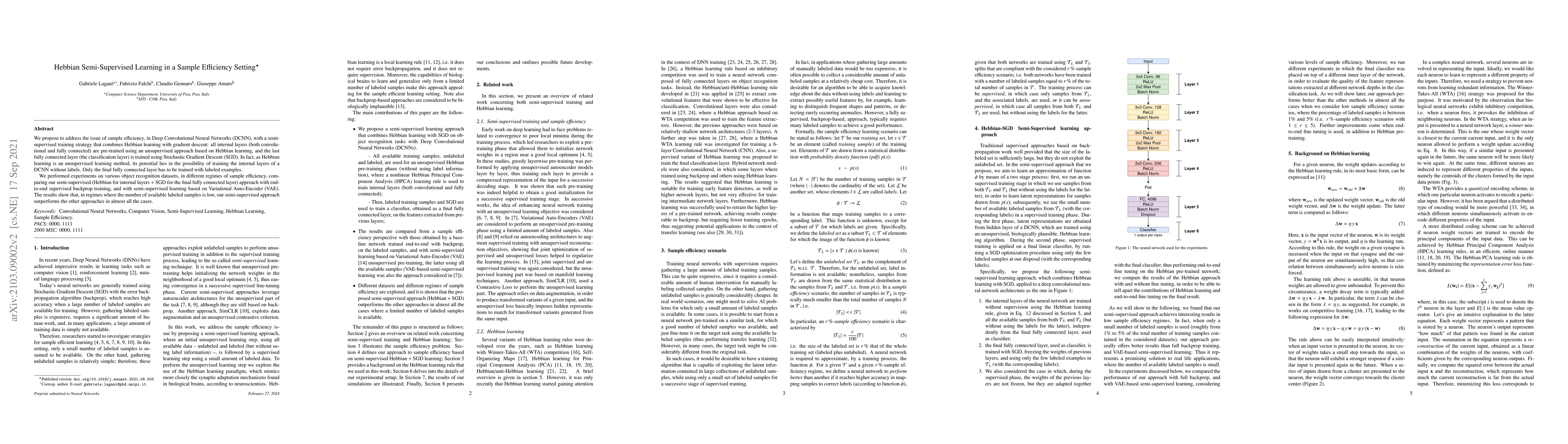 This paper proposes a semi-supervised learning strategy for Deep Convolutional Neural Networks that combines Hebbian learning for unsupervised pre-training of internal layers with SGD for supervised training of the final classification layer, achieving better performance than supervised and VAE-based approaches when labeled samples are scarce.