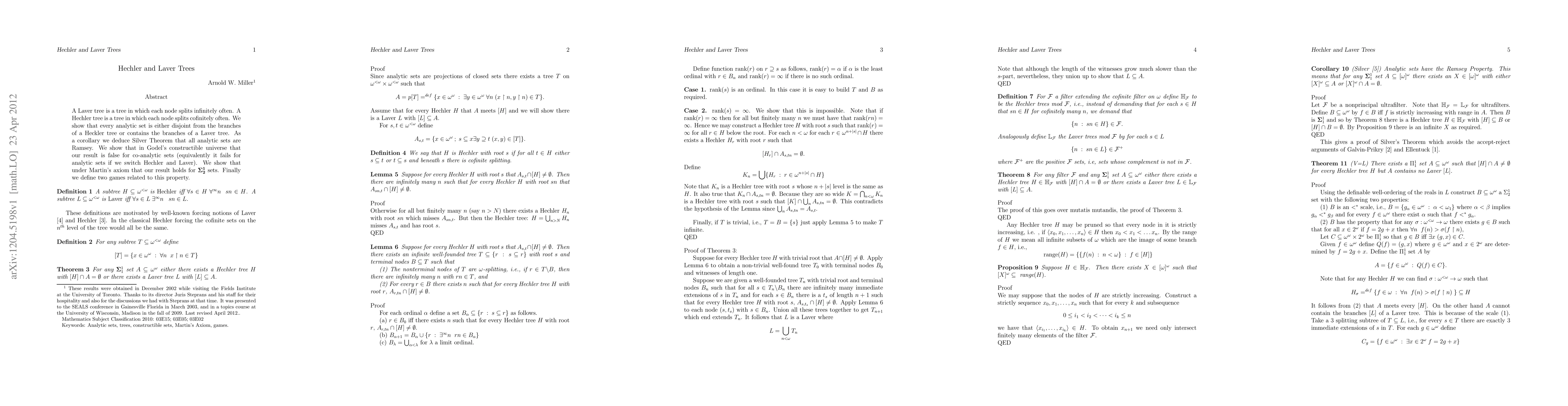 A Laver tree is a tree in which each node splits infinitely often. A Hechler tree is a tree in which each node splits cofinitely often. We show that every analytic set is either disjoint from the branches of a Heckler tree or contains the branches of a Laver tree. As a corollary we deduce Silver Theorem that all analytic sets are Ramsey. We show that in Godel's constructible universe that our result is false for co-analytic sets (equivalently it fails for analytic sets if we switch Hechler and Laver). We show that under Martin's axiom that our result holds for Sigma^1_2 sets. Finally we define two games related to this property. Latex2e 8 pages Latest version at http://www.math.wisc.edu/~miller/res/index.html