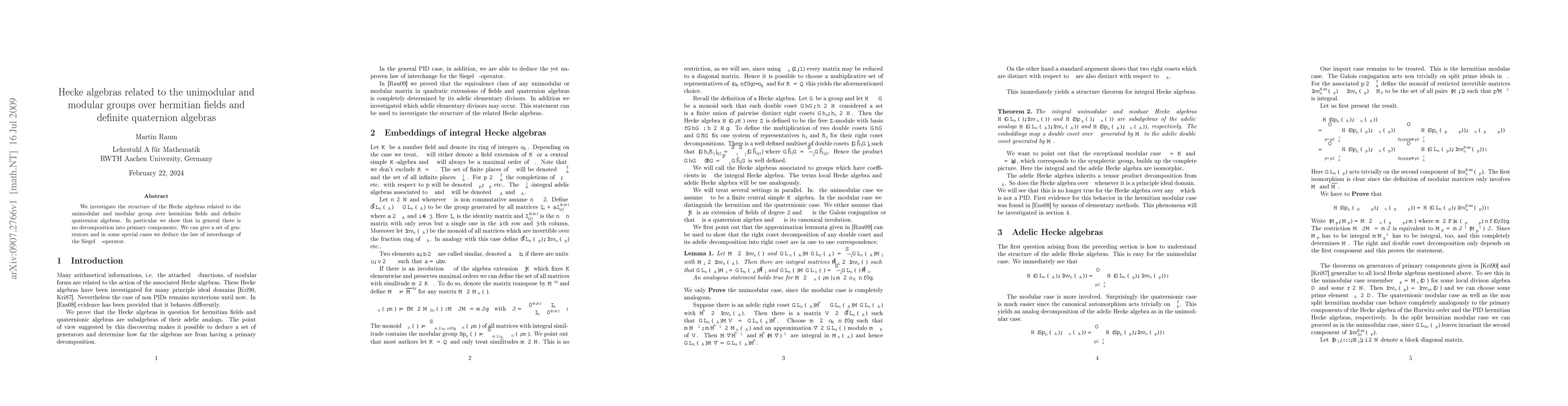 This paper explores the structure of Hecke algebras associated with unimodular and modular groups over hermitian fields and definite quaternion algebras, demonstrating the absence of a general decomposition into primary components and providing a set of generators, along with special cases where the law of interchange of the Siegel $\Phi$-operator is deduced.