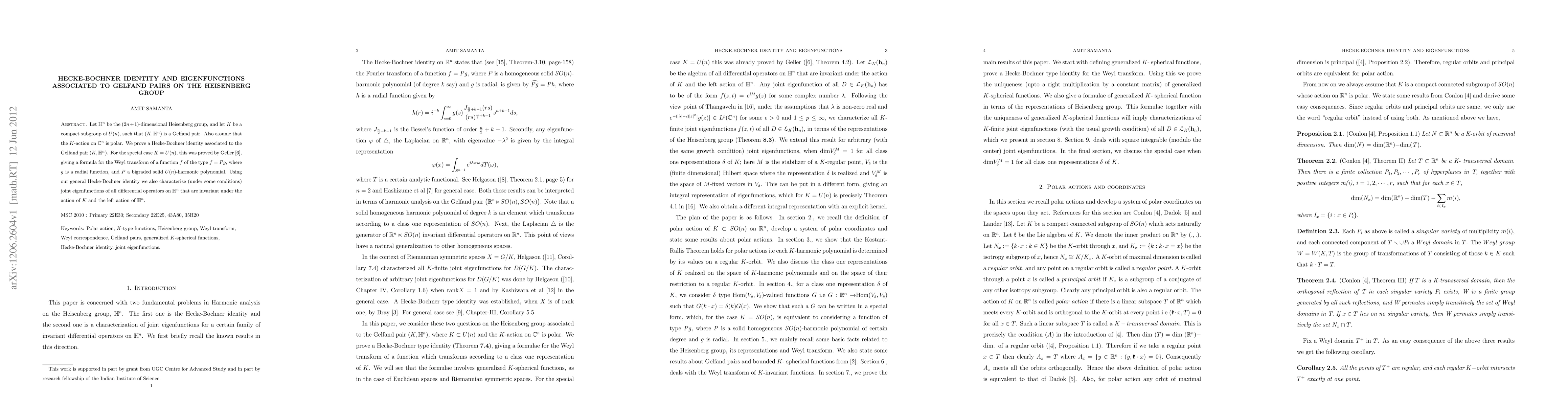 Let $\mathbb{H}^{n}$ be the $(2n+1)$-dimensional Heisenberg group, and let $K$ be a compact subgroup of U(n), such that $(K,\mathbb{H}^{n})$ is a Gelfand pair. Also assume that the $K$-action on $\mathbb{C}^n$ is polar. We prove a Hecke-Bochner identity associated to the Gelfand pair $(K,\mathbb{H}^{n})$. For the special case $K=U(n)$, this was proved by Geller, giving a formula for the Weyl transform of a function $f$ of the type $f=Pg$, where $g$ is a radial function, and $P$ a bigraded solid U(n)-harmonic polynomial. Using our general Hecke-Bochner identity we also characterize (under some conditions) joint eigenfunctions of all differential operators on $\mathbb{H}^{n}$ that are invariant under the action of $K$ and the left action of $\mathbb{H}^{n}$.
