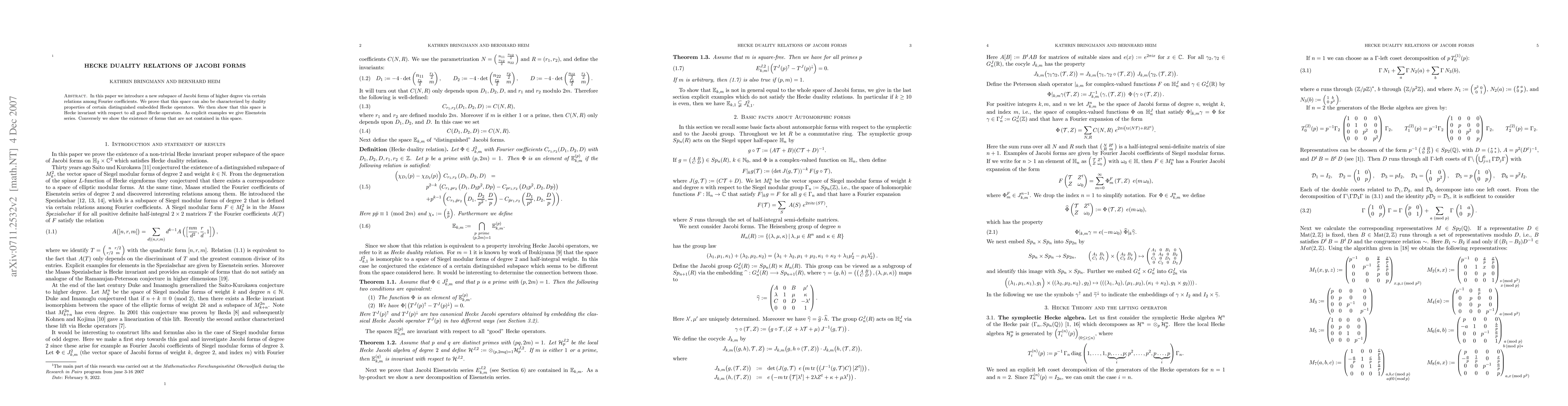In this paper we introduce a new subspace of Jacobi forms of higher degree via certain relations among Fourier coefficients. We prove that this space can also be characterized by duality properties of certain distinguished embedded Hecke operators. We then show that this space is Hecke invariant with respect to all good Hecke operators. As explicit examples we give Eisenstein series. Conversely we show the existence of forms that are not contained in this space.